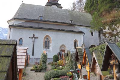 ハルシュタットの町の高台にある小さな教会です。観光化されておらず、地元の人が普通に使っているようです。私が訪問した際も、神父さんがミサの準備をされていました。行き方はハルシュタットの船着場から、正面の道を右手側(北側)に真っ直ぐ進んでください。そうすると看板があるので、そちらの階段を登っていけば墓地に出られます。入口は墓地の反対側です。