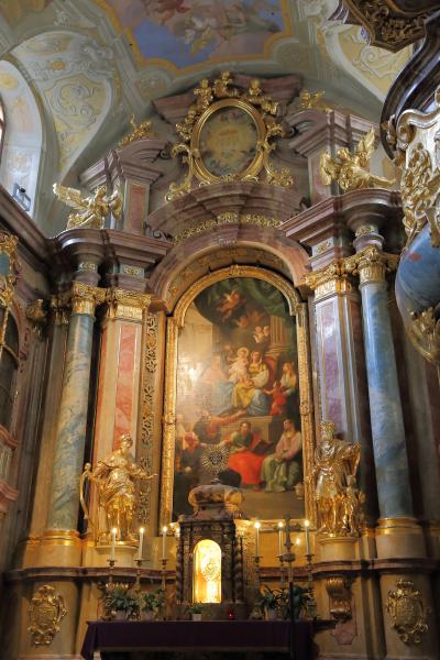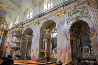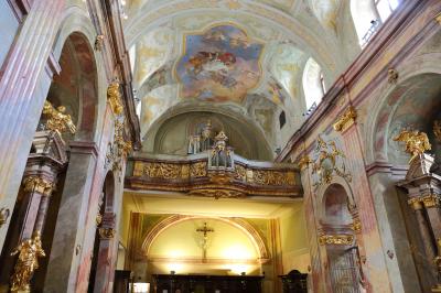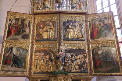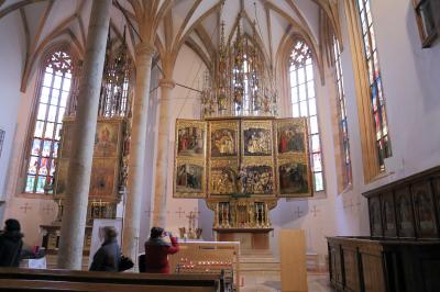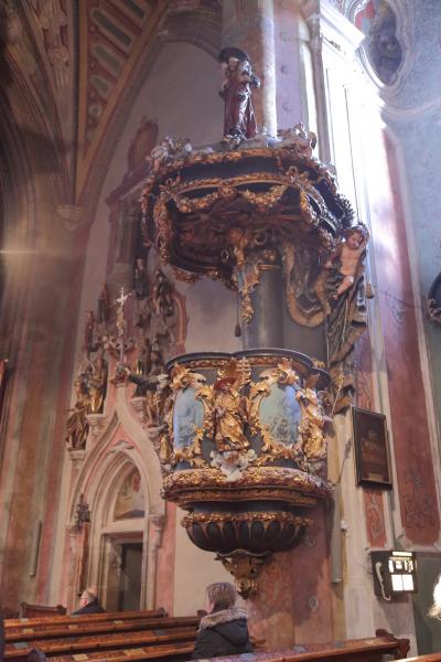 教会はサイズ的にはそれほど大きくありません。外見も地味です。ですが、内部の装飾が物凄く豪華です。身廊の装飾も見事ですし、礼拝用の祭壇や、身廊の中央にあるトーマス・シュバンタラーによる黄金の祭壇、後陣のミヒャエル・パッハーによる主祭壇とも、大きな街の有名な教会にあっても不思議の無いレベルです。