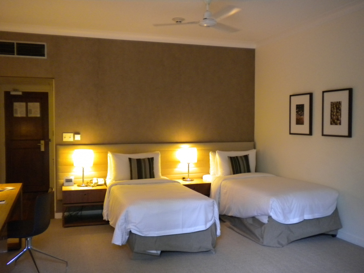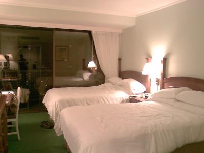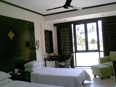 部屋はデラックスルーム。と言っても、海側かその裏側かの違いみたいです。海側の1階の部屋でしたが、朝陽が当たって気持ちよかったです。スイートルーム以外はベランダはありません。室内には大きなファンがあり、いい雰囲気です。ベープがありました。窓は開きません…。床はジュータンじゃなくてタイル、スリッパではなくてビーチサンダルがありました。食事はいくつかレストランがあります。売店もあります。テレビはNHKが見られます。ケロンレストランへは、1時間に1~2本の無料巡回シャトルバスで行けます。敷地内にフードコートやボーリング場もありました。敷地がとても広く、朝の散歩も楽しいです。従業員はどの人もいい接客で、不快に感じたことは一度もありませんでした。何と言っても、プールが気持ちいいです。日本語は通じませんでした。
