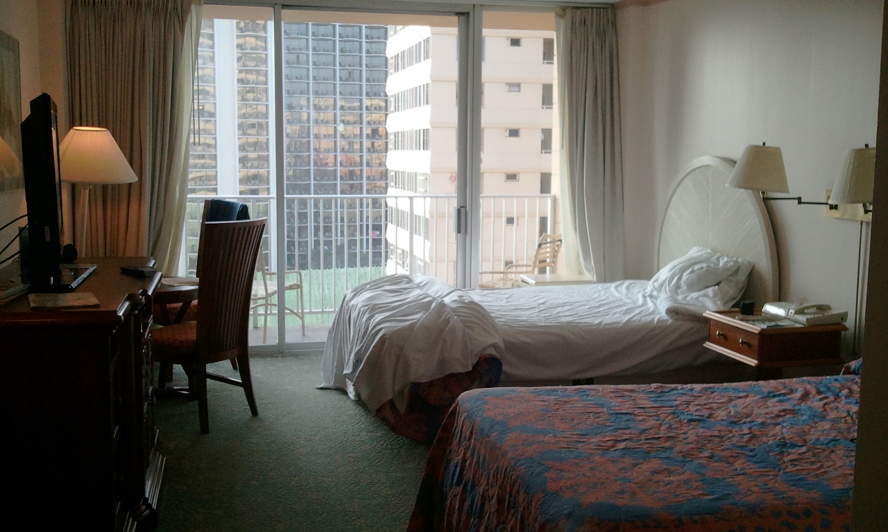 今回は、ちょっと高めのカテゴリー(タワーウイング25~29階)に泊まりました。アメニティ類はさほど変わりないのですが、やっぱり部屋からの眺めがよかったです。ダイアモンドヘッド側の部屋でしたが、目の前にハイアットがあって、ドドーンとダイアモンドヘッドが見えるわけではありませんが、キレイな海も見えてラナイでビールを飲みながらのんびりするには最高でした。ただ、プルサイドでは毎夜バンド演奏があり、けっこう窓を閉めていても聞こえてくるので、静けさは期待できません。