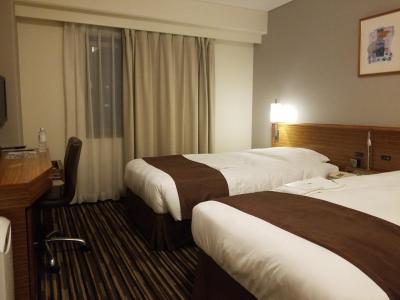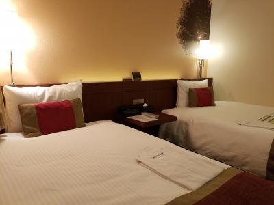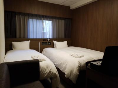 ダブル?の部屋に簡易ベッドを入れて、無理くりツインにした部屋でした。前もってこのことを了解してチェックインしたので、特に驚きはありませんでした。ウエルカムドリンクチケットがあり、1階のレストランでいただけます。持ち帰りもできます。ビールやジュースでした。繁華街の中にあるので、出歩くのにも便利です。桜島行きの船乗り場にも歩いてすぐです。