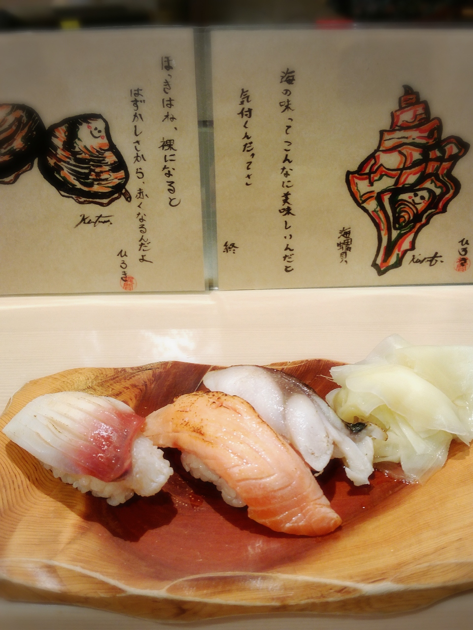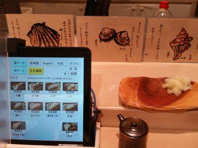 以前から気になっていたのですが、いつも行列していたので諦めていました。今回は14時過ぎということもあってかすぐに入れました。タッチパネルで注文、合計もすぐにわかる。腹いっぱい食べたら高額になっちゃうけど、小腹を満たすくらいで行けば、気持ちも満たされます。店員さんがちょっとふざけ過ぎていたような…。盛り上げようとしているのでしょうが、カウンターの中だけで盛り上がっていました…。