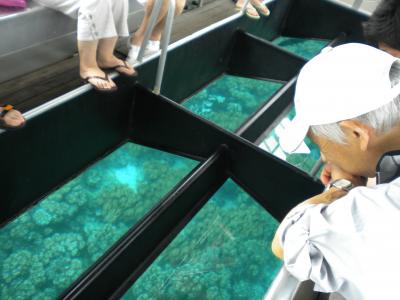泳がないし、他にも観光したいし…。ということで、昼過ぎにはケアンズに帰ってくるコースにしました。現地には2時間ちょっとの滞在でしたが、グラスボートに乗ってみました。往復のチケットに、このグラスボート代や現地でのプール入場料などが含まれているのもあります。日本からHPでチケットの予約をして、現地の乗船ターミナルでプリントアウトしていたものを見せて、チケットに換えました。船内には酔い止め薬が自由にもらえましたが、事前に飲んでおく方がいいと思います。けっこう冷房がきついです。ホテルからビーチタオルを持っていきましたが、体にかけました。グリーン島には、ホテルもあるし、食べるところやお土産屋さんもあります。シャワーもあればロッカーもあります。ケアンズにはビーチはありません(人口のビーチのようなプールはあります)ので、砂の自然なビーチがよければ、一番近いグリーン島などもいいかもしれません。グリーン島以外にも島はあります。
