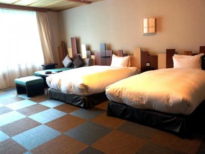 部屋は当初和室だったのですがあまりにも平凡な古い旅館のようでしたので、一人3,150円プラスしてリニューアルしたというツインの部屋に変更しました。モダンというかなんというか…。プラスして変更してよかったです。