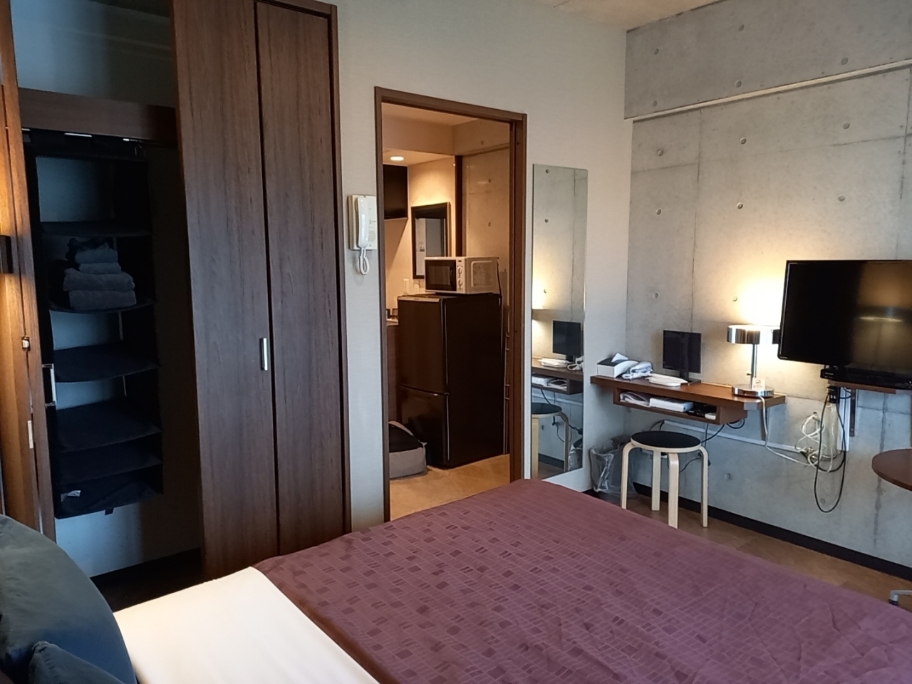 洗濯機と乾燥機が部屋にあるところを探していたら見つけました。牧志駅から歩いて近いところです。ホテルの受付の他にも出入り口があり、暗証番号を打ってドアを開錠します。部屋に入る時も同じ暗証番号を打って鍵が開きます。ということで、ルームキーはありません。ベランダがあり、開放的です。電子レンジあります。食器類は有料です。チェックインすると洗濯洗剤をくれます。スリッパは使い捨てのものではありません。風呂に手桶や洗面器はないので、湯船のお湯をすくうことはできません。間接照明で、それも電球色の暗めなので好き嫌いが分かれるかもしれません。シーツの色が黒?濃紺?なのが気になりました。白いシーツに慣れているので…。