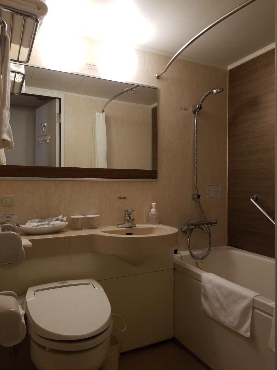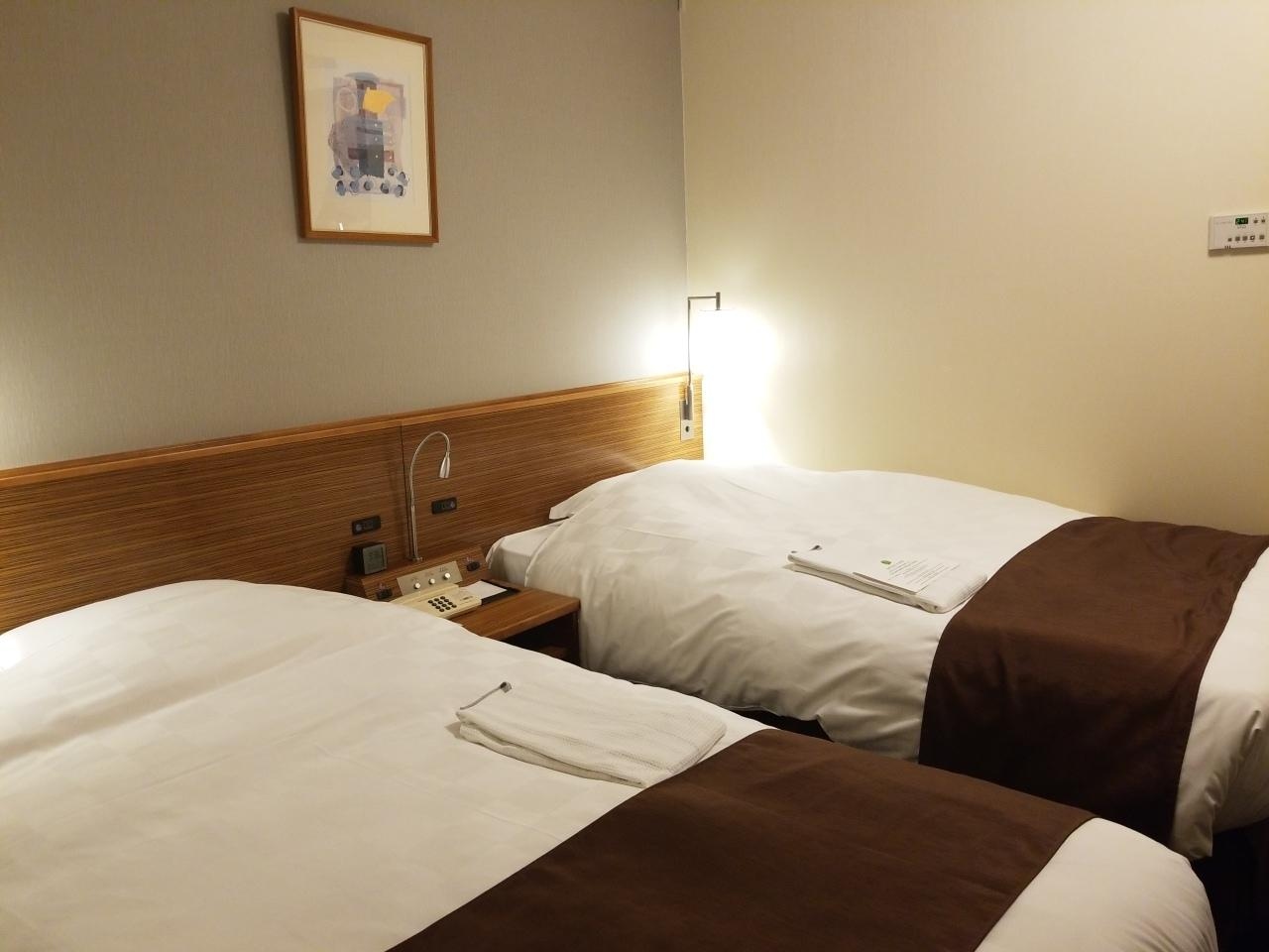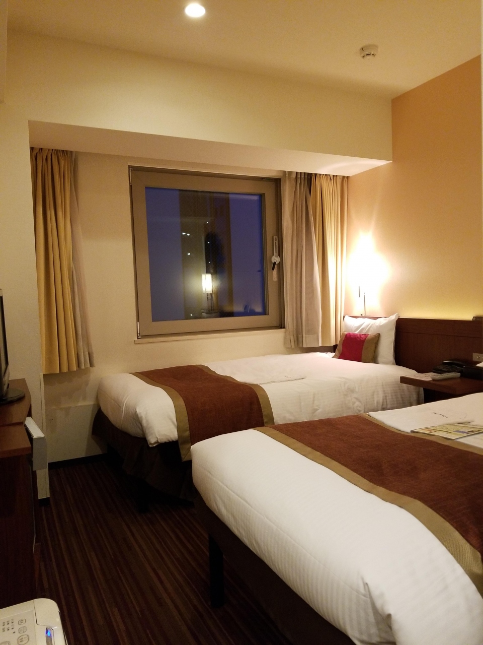 ダブル?の部屋に簡易ベッドを入れて、無理くりツインにした部屋でした。前もってこのことを了解してチェックインしたので、特に驚きはありませんでした。ウエルカムドリンクチケットがあり、1階のレストランでいただけます。持ち帰りもできます。ビールやジュースでした。繁華街の中にあるので、出歩くのにも便利です。桜島行きの船乗り場にも歩いてすぐです。