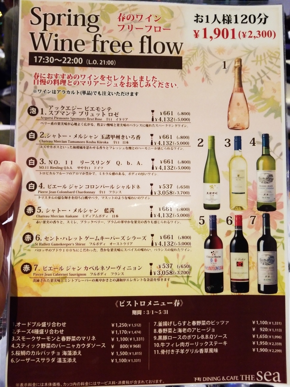 ワイン飲み放題プランを利用しました。料理はアラカルトを注文。いい雰囲気の中、ゆっくり種類豊富なワインと美味しい料理を楽しむことができました。ただ残念なのが、事前にHPのクーポンの利用ができるか問い合わせをして、利用できると回答をもらっていたのですが、いざ会計の時にクーポンを提示すると、アラカルトはできないとのこと。だったら、問い合わせの時に、使えない場合を教えて欲しかった。その後、事前に問い合わせをしておいたのに使えなかったことをメールで報告すると、今後このようなことがないようにというような謝罪の内容…。今後?じゃぁ、私の場合は?誠意が感じられなかったので、サービスの評価は最低にしました。とても感じのいい時間だったのに、残念です…。