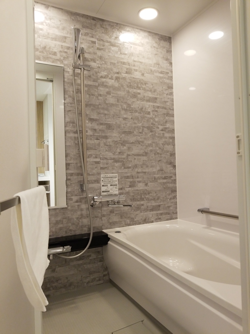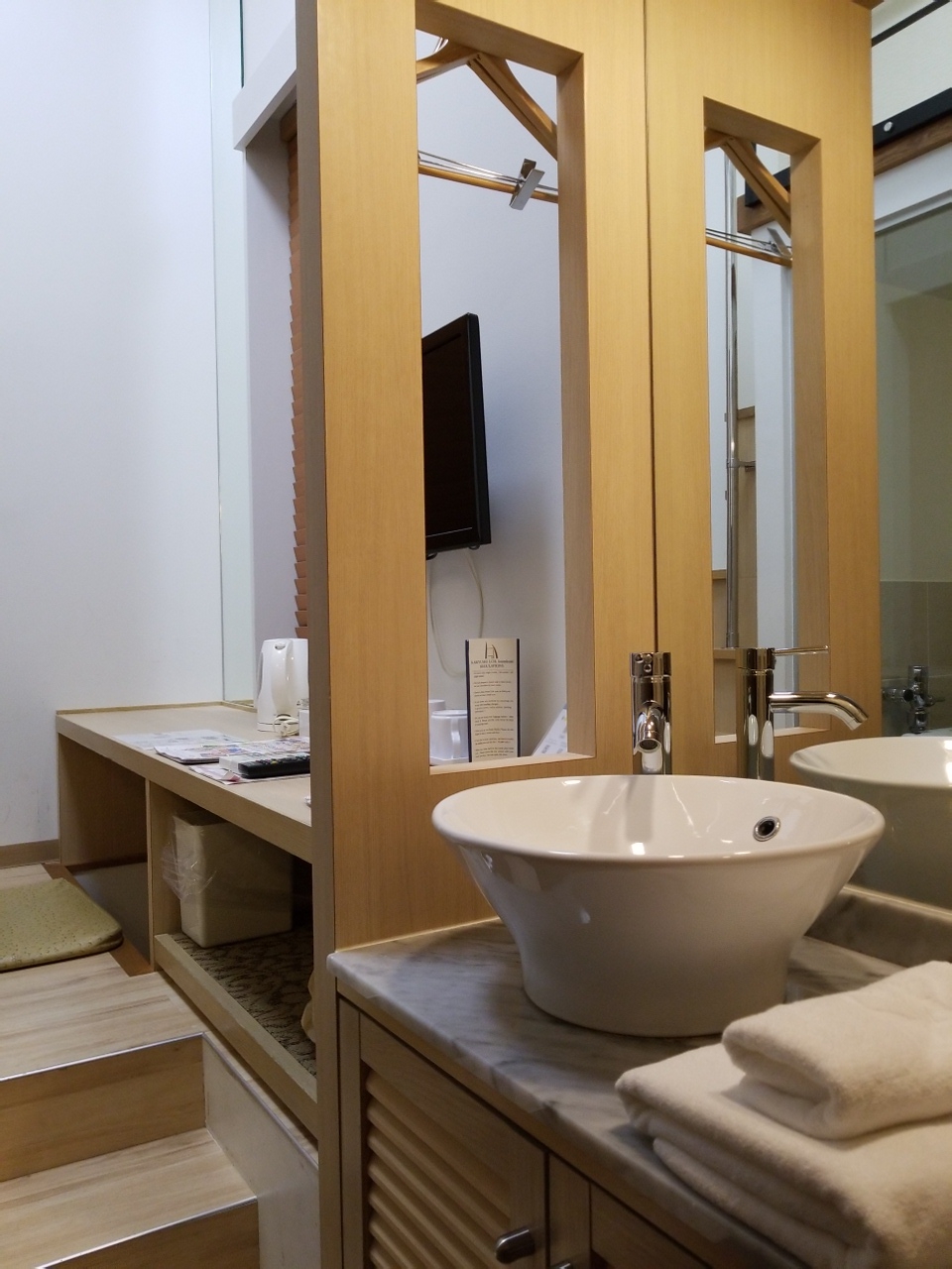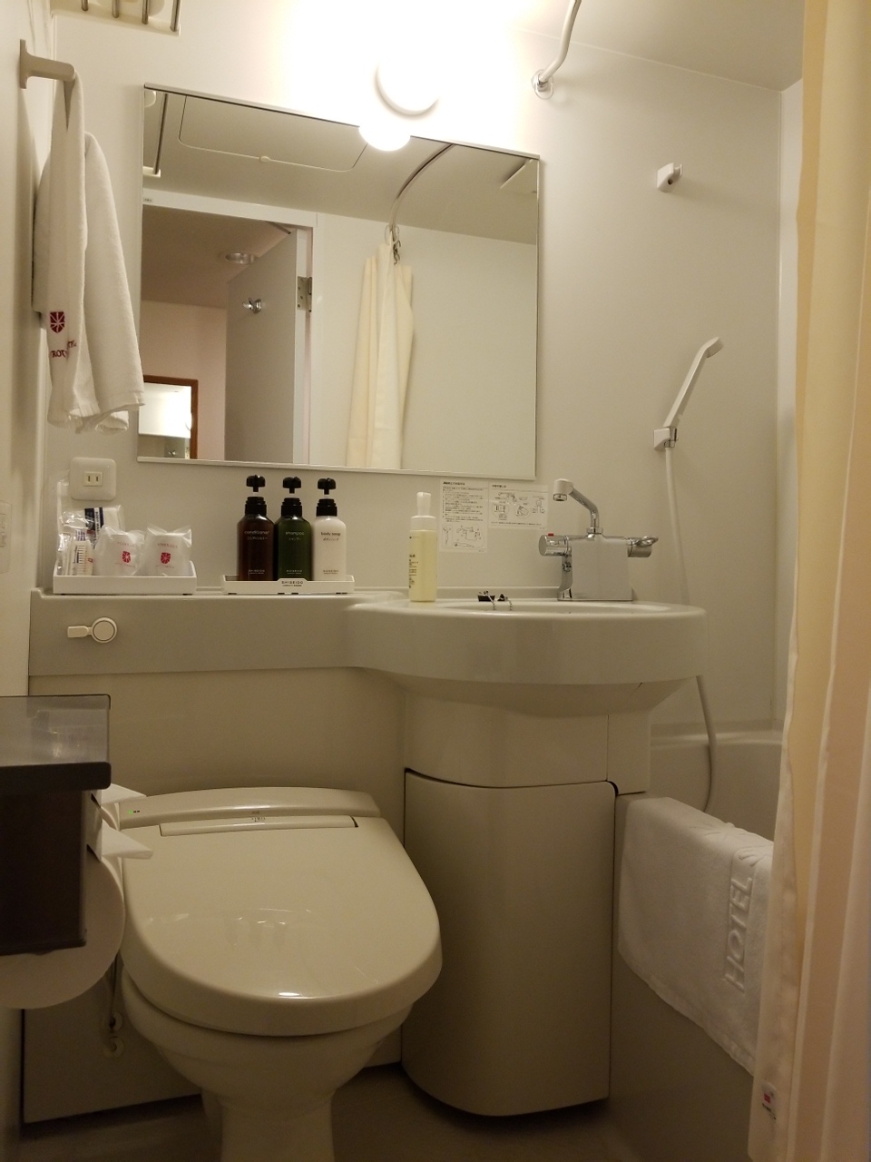 部屋は、浴室とトイレが別になっているので、家のお風呂に入っているようでゆっくりできます。アメニティは歯ブラシだけ洗面所にあり、その他はすべてフロントの横にあり、自分で必要なものを取ります。