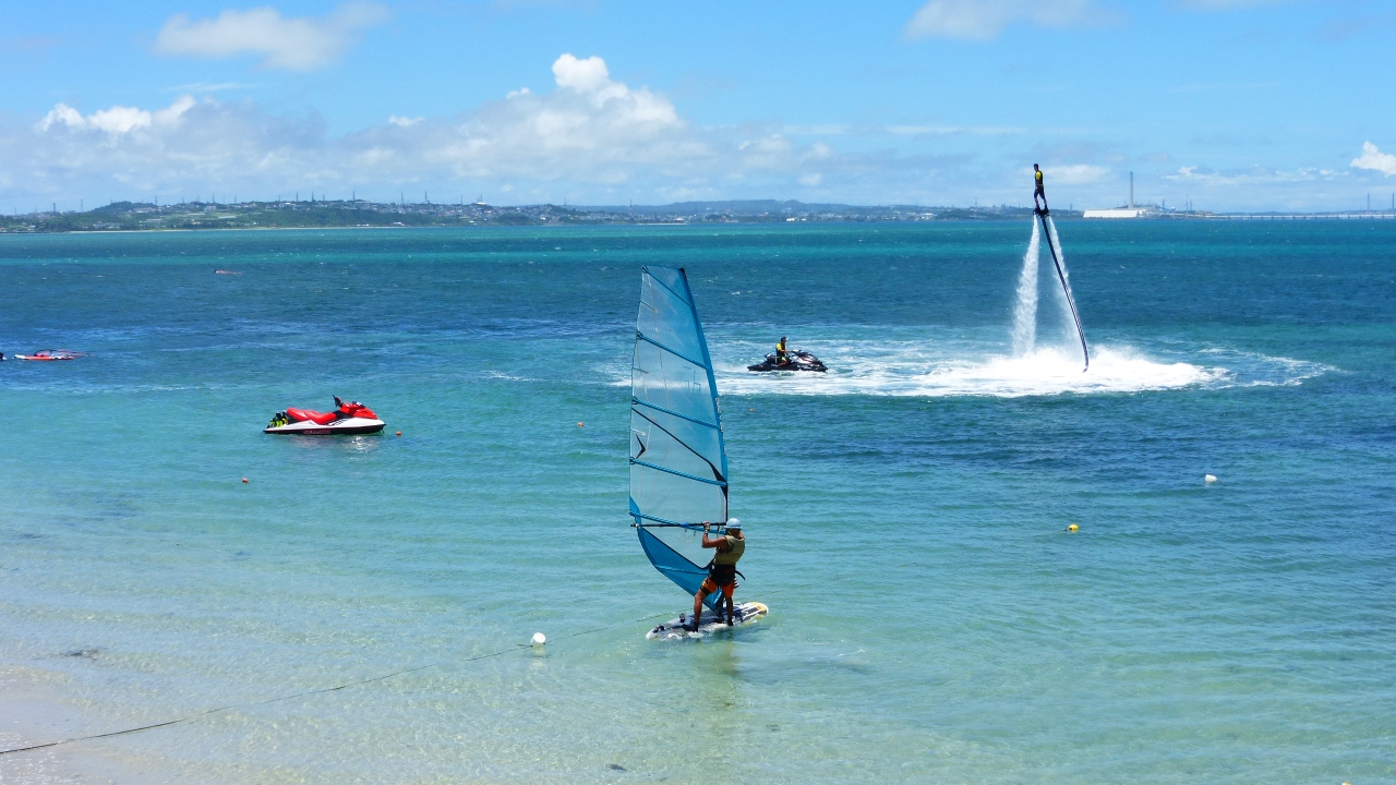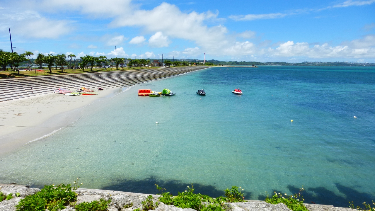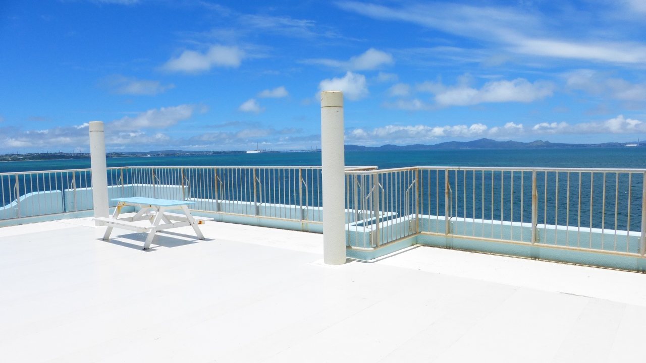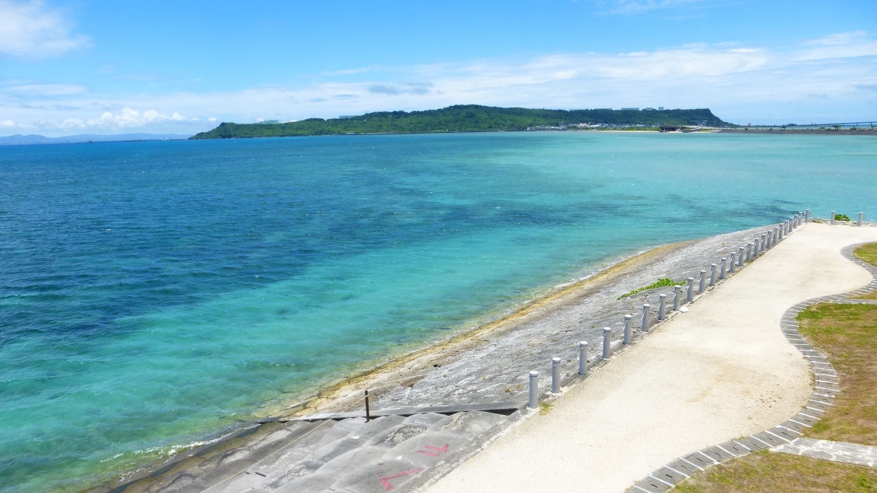 濃い青と水色のコントラストが奇麗な海と、平安座島などが一望できます。