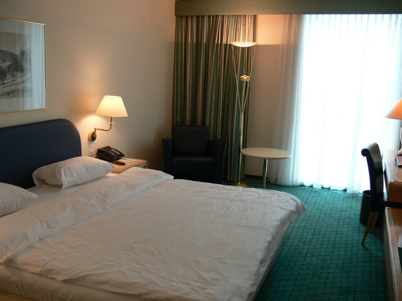 ツェルマット滞在の前後に各1泊づつしました。どちらの予約も、アップルワールドで、15,800円(朝食付)で予約したのですが、前泊の時は到着が遅くなった為か、若干狭いシングルルームを、後泊の時は夕方のチェックインでしたが、広めのダブルルームをアサインされました。画像は、後泊のダブルルームの部屋です。ホテルへは、チューリッヒ空港の到着階のターミナルAとターミナルBの間に各ホテル行きのホテルバス乗り場があります。ヒルトンのホテルバスは、平日は5時55分~23時30分まで、約15分~30分毎に運行されています。(土・日は、6時10分~23時40分まで、30分毎の運行です)空港からホテルまでは5分程で到着します。空港からも非常に近く、部屋も最近改装された様で綺麗ですし、冷房も完備されています。朝食のビュッフェの種類も多く、さすがにヒルトンです。また部屋では、JSTVを観る事が出来ました。空港駅~チューリッヒ駅までは列車で10分弱ですので、空港利用の為だけでなく、チューリッヒ観光や出張でも便利に使えるホテルだと思います。特にアメリカンタイプのホテルを好まれる方には最適なホテルです。