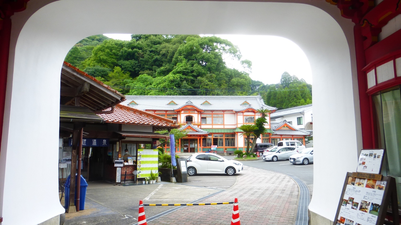 嬉野温泉のシンボル的な特徴的な門の奥に、嬉野温泉新館(内部見学無料)があり、周りには数ヵ所の外湯温泉施設があります。