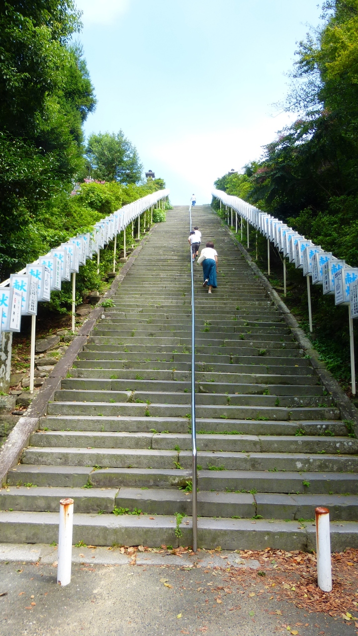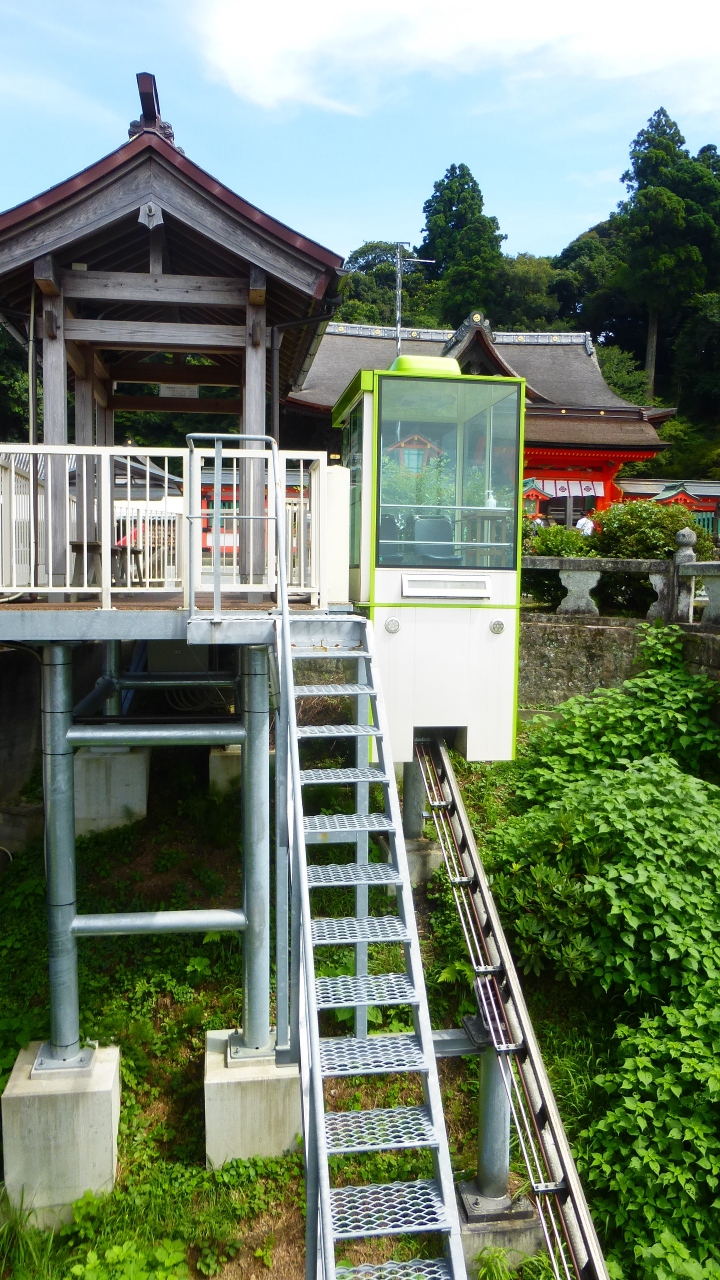 お年寄りや脚が悪い方の為に、石段左側にスロープカーは設置されていますが、コロナ禍の為か、運転中止になっていました。
