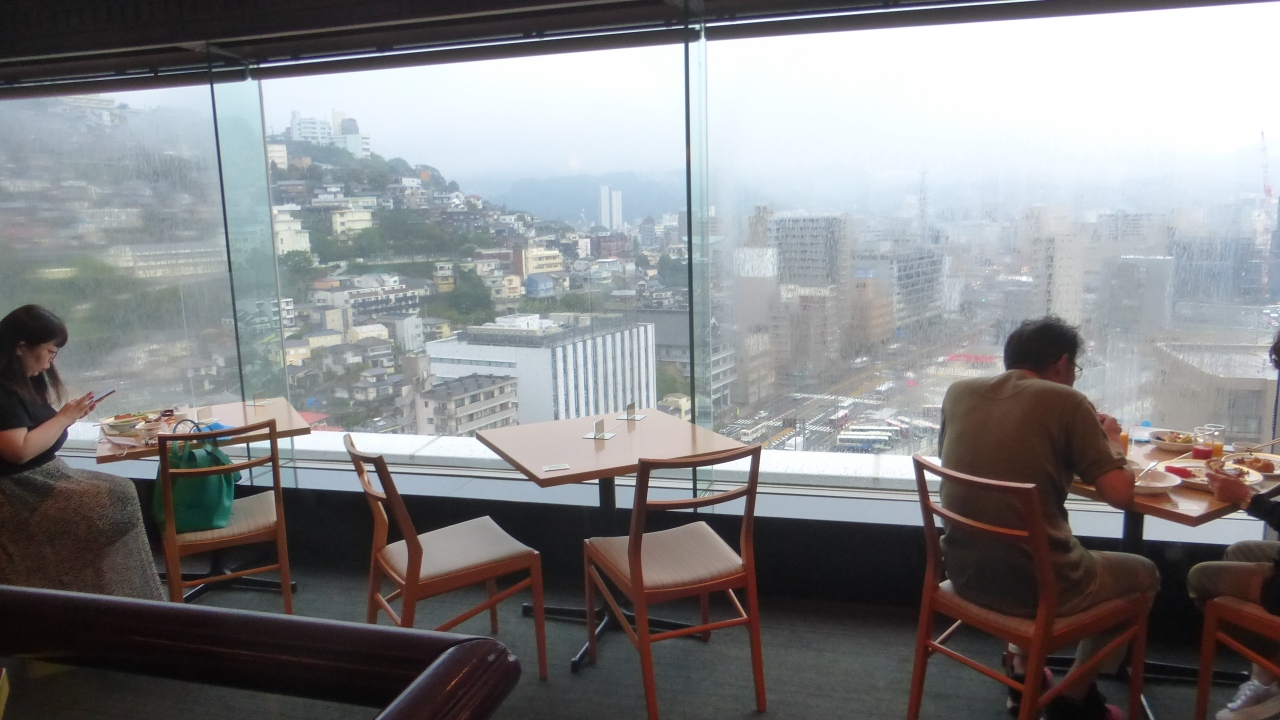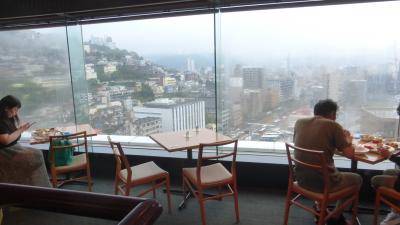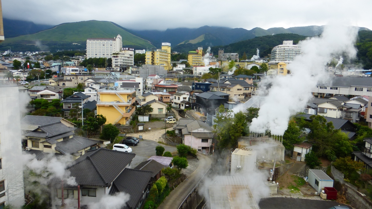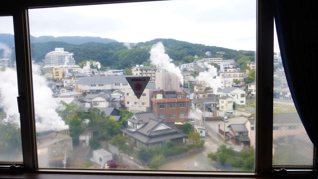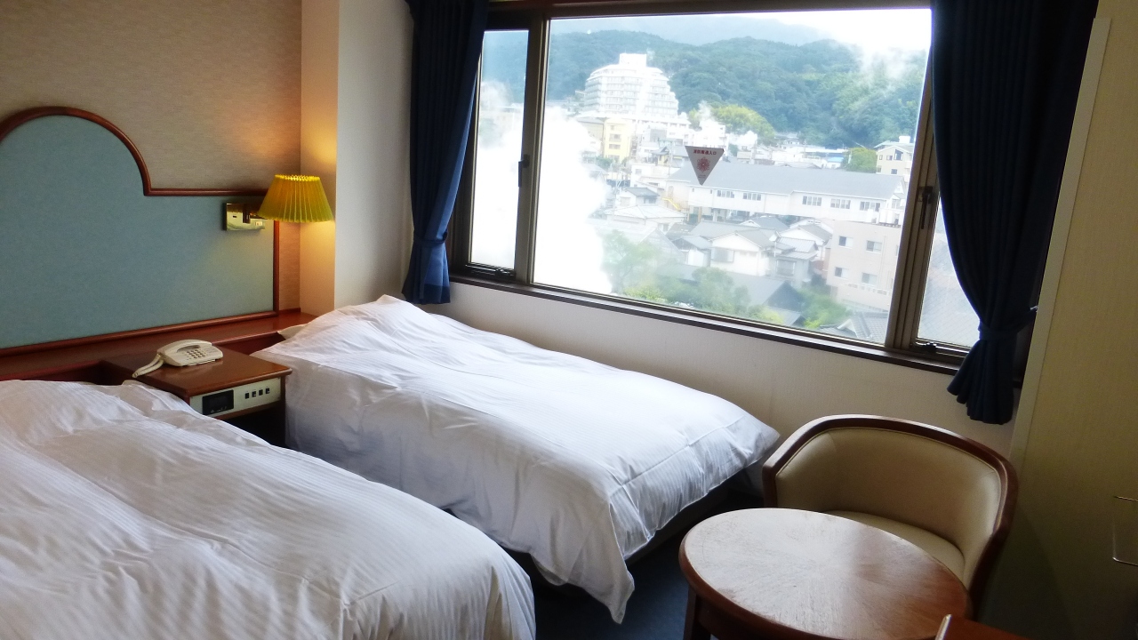 - 泊った北館ツインルーム(約18平米)は少し狭いが、鉄輪温泉街と湯けむりが見られて、如何にも温泉に来た感がする