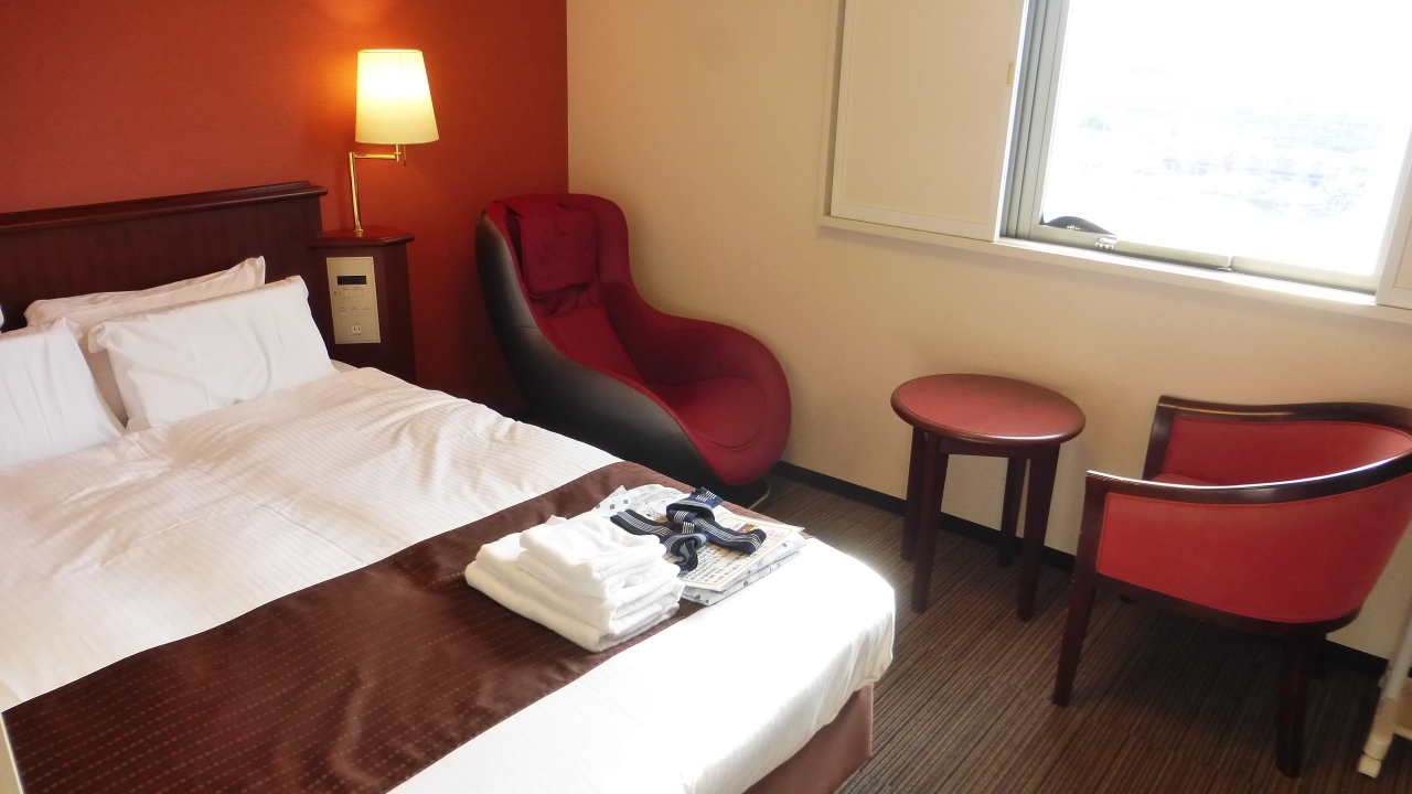 元々は、デラックスツインルーム(24平米)の1人利用、ビュッフェ朝食、夕食弁当付きで予約(10,600円)していたのですが、希望した西向き側にはデラックスツインルームはないとの事で、西向き側の部屋がある、リラックスダブルルーム(18平米)に変更して貰いました。