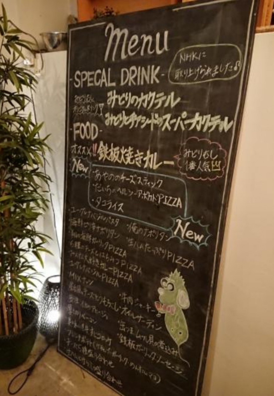 お店は阪急三宮駅北側に広がる飲み屋の入りくんだ路地にあるので分かりにくいです。入り口の看板からは怪しさしかありませんが、店内は至って普通です。どちらかと言うとbarです。バルなので料理も抱負にあります。今回は食事後だったので店内での食事はしていません。気になる店名の「みどりむし」が入ったカクテルはいただき、普通に美味しいです。