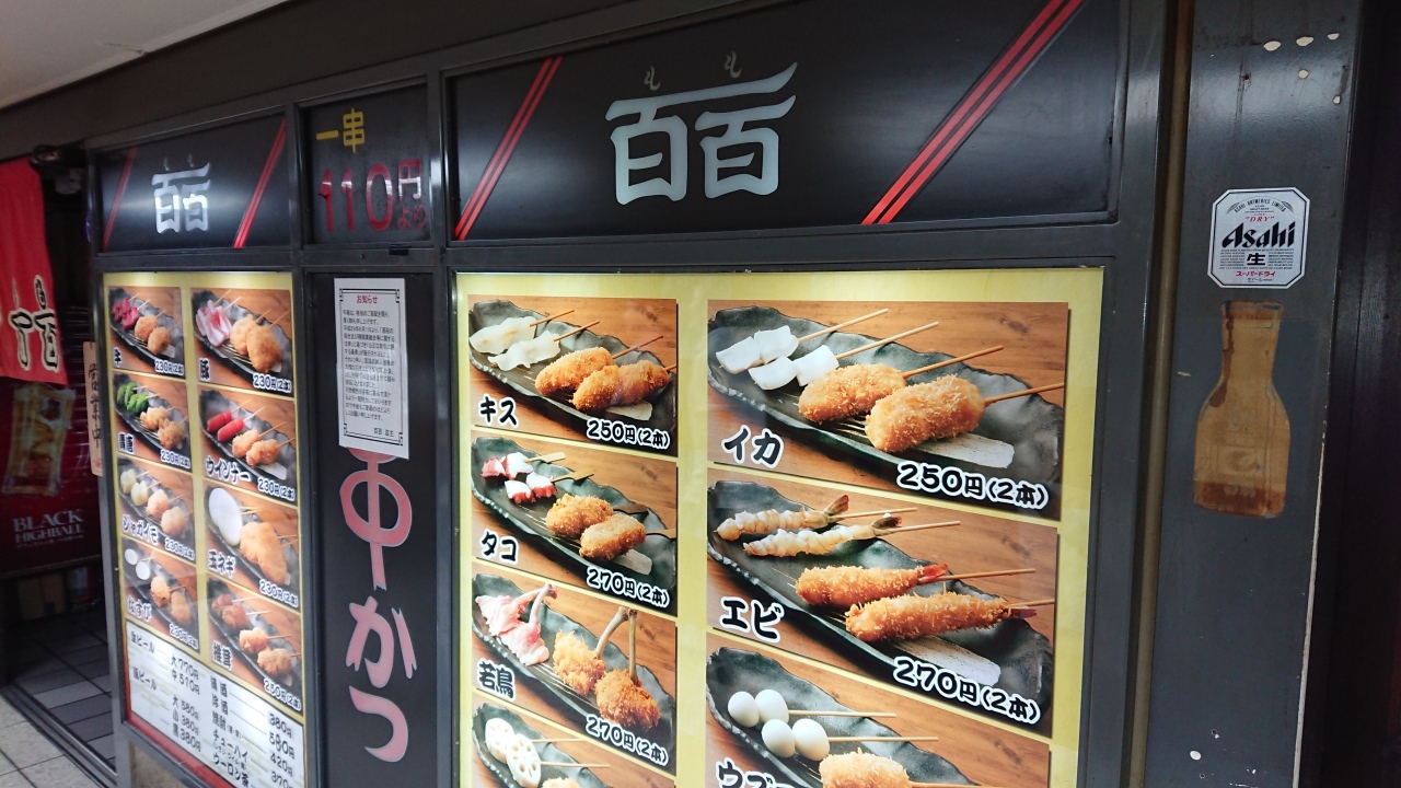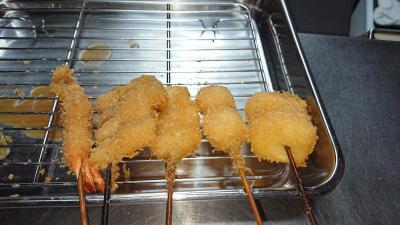 梅田新食堂街にあるスタンディングスタイルの串カツ屋さんです。昼間より夜の方が大阪のゴチャゴチャ感が出て混雑しています。店内での注文する場合の単品は2本単位となっているので一人の場合は注文する量に注意をする必要があります。言うまでもありませんがソースの2度漬けは禁止です。