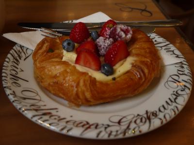 メルボルン市内に数店舗あるパン屋さんです。妻がパン好きなので、朝食のパンをここで調達しました。ホテルからは徒歩で10分弱のビル内にあります。着いたのが9時ぐらいで朝食には遅かったのか、お客さんはまばらです。私は、この後のクィーンビクトリアマーケットで食事をとろうとカフェだけを頼み、妻はケーキっぽいデニッシュを頼みました。いちご、きいちご、ブルーベリーが乗っていて見た目はケーキですが、味はあっさりとパン系で、朝食にぴったりでした。(私も一口味見しました)