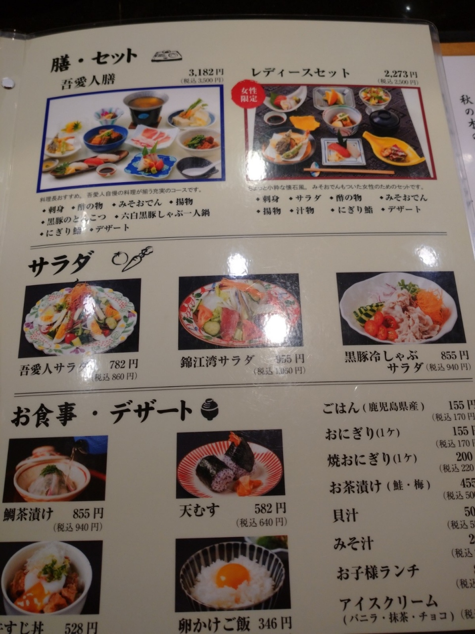 あーちゃんさんに鹿児島でのオススメのお店を紹介していただいたのがこの吾愛人。妻同伴では、不穏な名称の店舗ですが、味、量、コストパフォーマンス三拍子揃っていました。私は、吾愛人膳を妻はレディースセットを注文しましたが、みそおでん、黒豚のしゃぶしゃぶ、地魚の刺身など薩摩料理を堪能することができました。