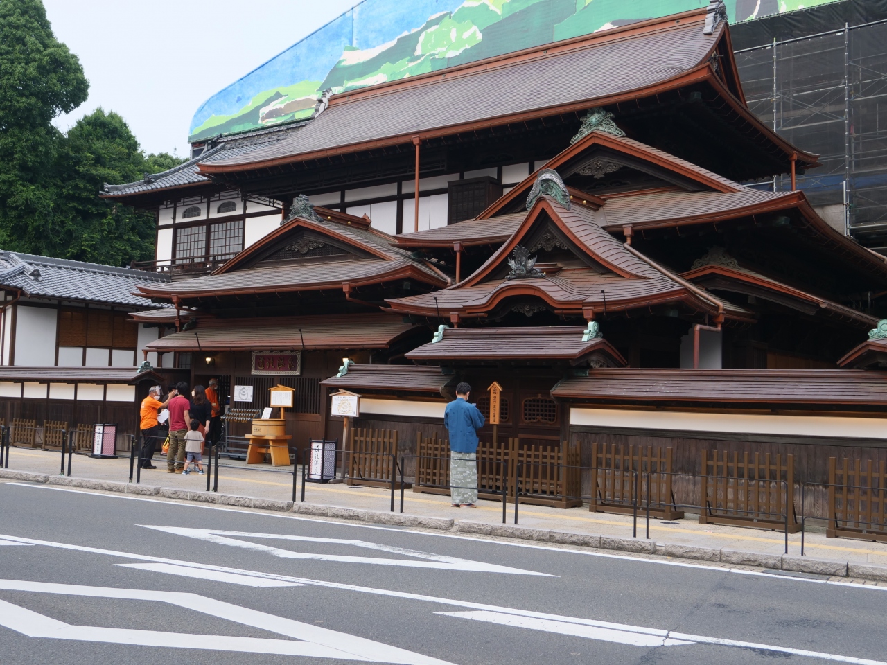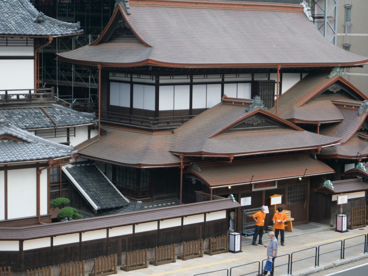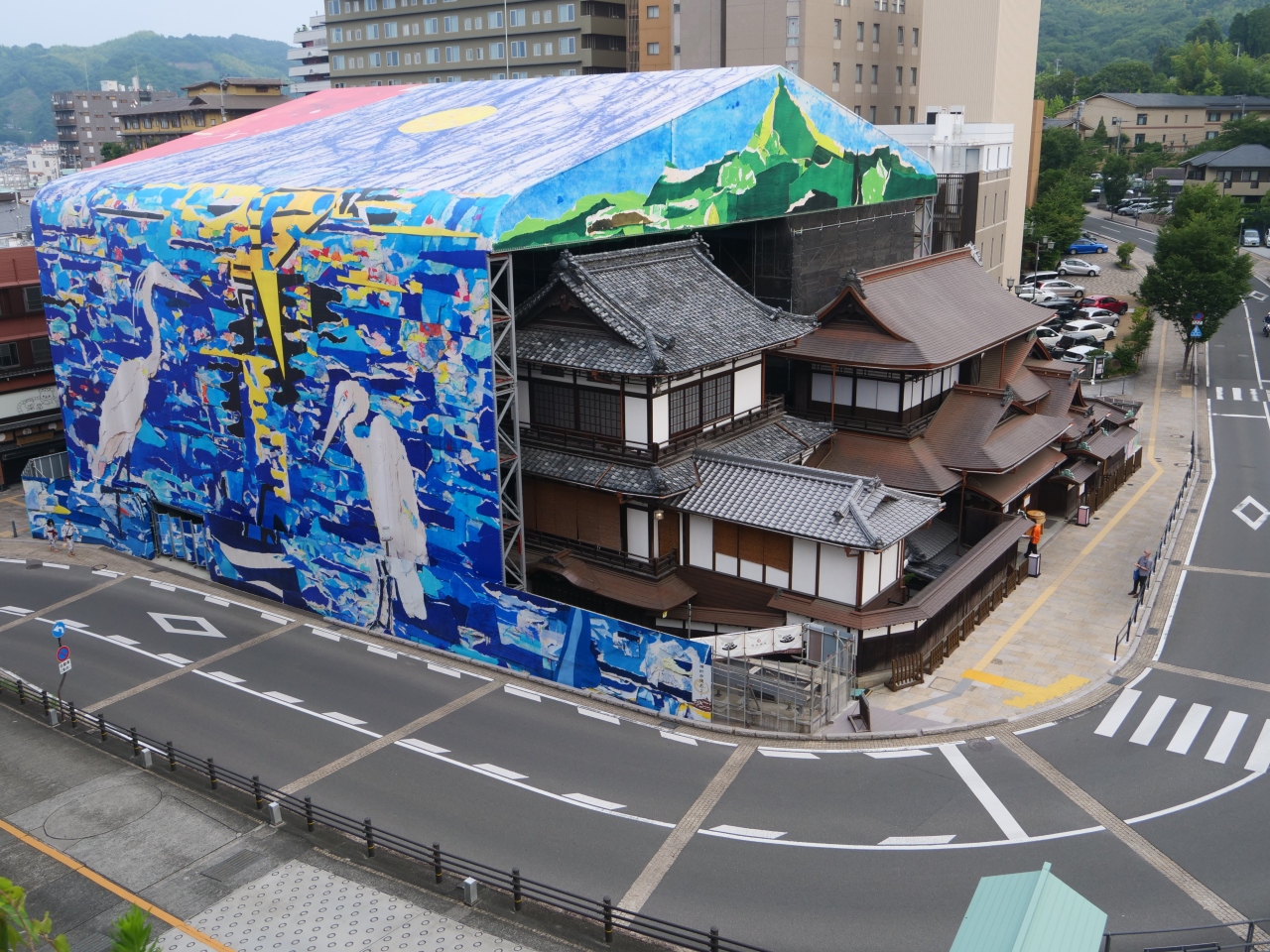 道後温泉本館は写真でみていて雰囲気がすごくいいなと思っていたのですが、2019年から改修工事中です。工事中でも多少は、見学できるかなと期待していたのですが、工事用シートは、現代的ですが、本館には似合わないような気がします。それでも一部その面影を見ることができて、2年後が楽しみです。