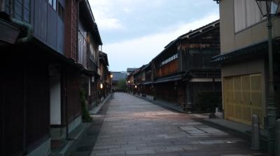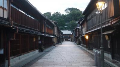 金沢滞在3日目の早朝散歩でひがし茶屋街に行ってきました。人気の観光場所なのでかなり混雑すると聞いていましたが、さすがに早朝では人出はありません。じっくりと写真撮影ができました。街を歩いていると、どこからか三味線の音がかすかに聞こえます。この時間に?という気がしましたが、練習なんでしょうか?仕込みさんらしき女の子が一人茶屋街を自転車で通り、目顔で挨拶してくれました。お店はもちろん開いていませんが、こんな早朝の茶屋街も楽しめます。