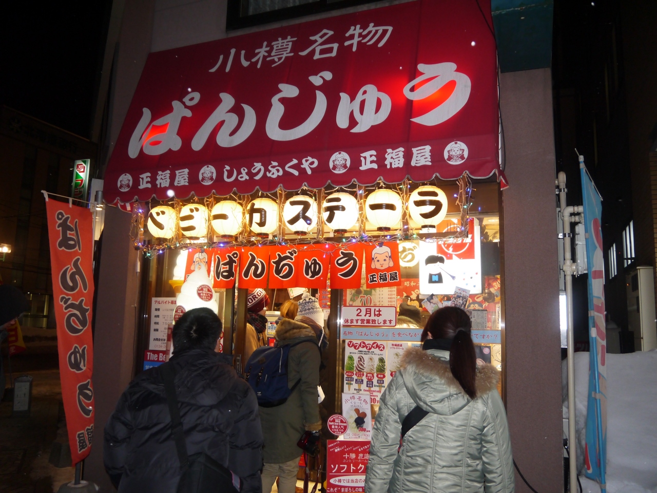 「ぱんじゅう」って国内どこでもあるのかと思っていましたが、そうでもないようです。北海道では、小樽が発祥の地ということで、正福屋 (小樽本店) と西川ぱんぢゅうが双璧です。今回、西川ぱんぢゅうに寄ったところ営業終了だったので、雪明かりの路の会場途中にあった正福屋さんで買いました。外国人の方もけっこう、立ち寄っていて盛況でした。こちらの店のぱんじゅうは、小樽の田中ぱんじゅうという店のレシピを譲り受け、昔ながらの伝統に基づき、作られているそうです。ぱんじゅうは、半球状で焼き上げられ、もちもちでこしあん、つぶあんとも甘すぎず昔ながらの素朴な味がしました。