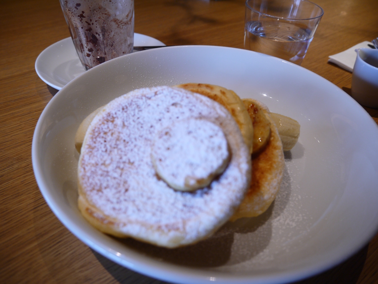 土曜日の9時に行きましたが、お客さんは6割ほどの入りで、待たされることなく入れました。早速、世界一の朝食「リコッタ・ホットケーキ・ウィズ・フレッシュバナナ&ハニーコム・バター」とホットチョコレートを注文しました。