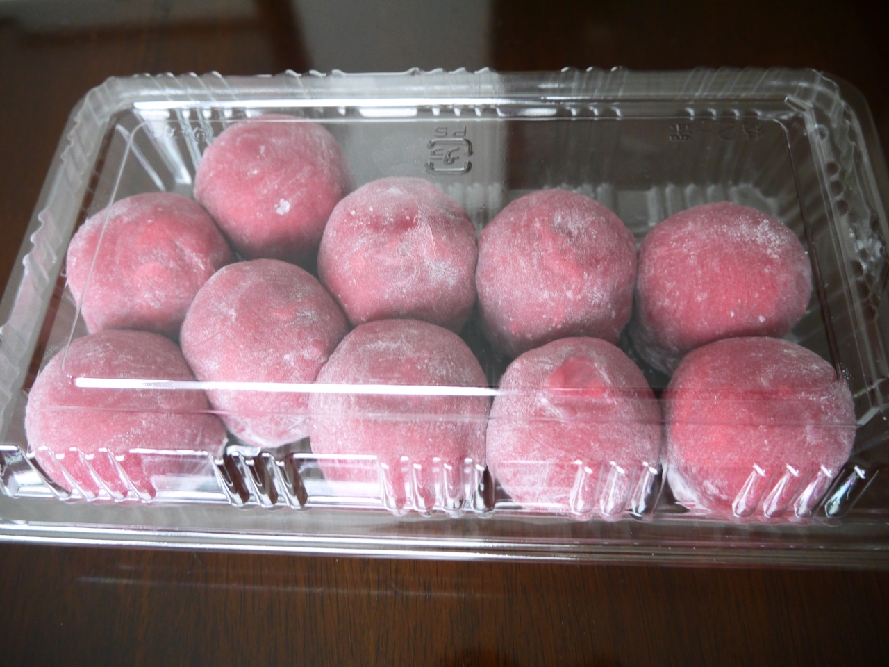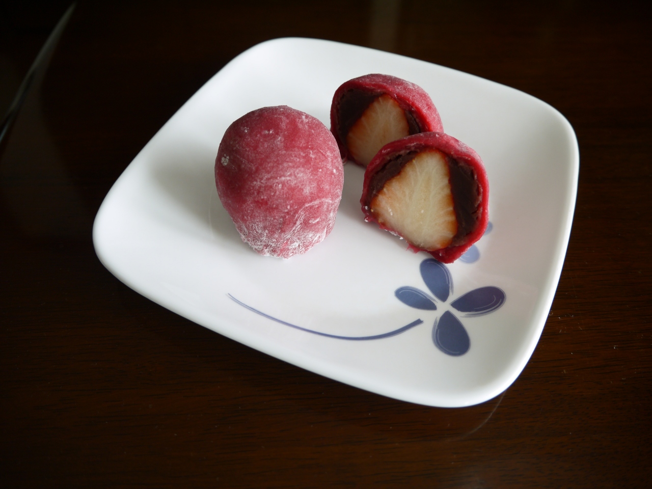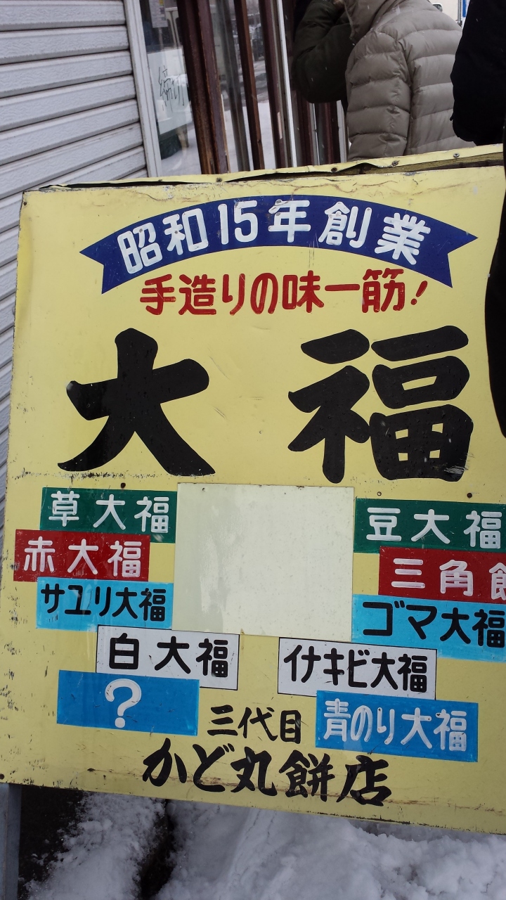 娘のリクエストで、2012年にいきなり!黄金伝説。の「行列の出来る即日完売グルメ」で全国7位に輝いた「かど丸餅店」のイチゴ大福を買いに行きました。朝5時にお店に着きましたが、もう40~50人並んでいます。お店前の道路に車が停まっていましたが、駐車禁止場所のため、摘発でパトカーがやってくると、蜘蛛の子を散らすように車は見えなくなりました。開店は6時ですが、先客が終わってようやく7時にお店に入れました。イチゴ大福は、イチゴの香りがすごく漂っています。串団子も買いました。家に帰っていただくと、串団子の餅はやわらかく、もちもちで弾力がありました。たれは、甘すぎず、上品でおいしいのですが、我が家の好みからするともう少し、濃いめの味付けが良かったかと思いますが、個々人の好きずきの程度問題かと思います。イチゴ大福は、イチゴの香りがすごく、いい味(酸味と甘みが適度なイチゴでした。)がしていました。大福のあんや餅よりも素材であるイチゴのうまさを生かしつつ、両者のバランスを上手にとった大福でした。