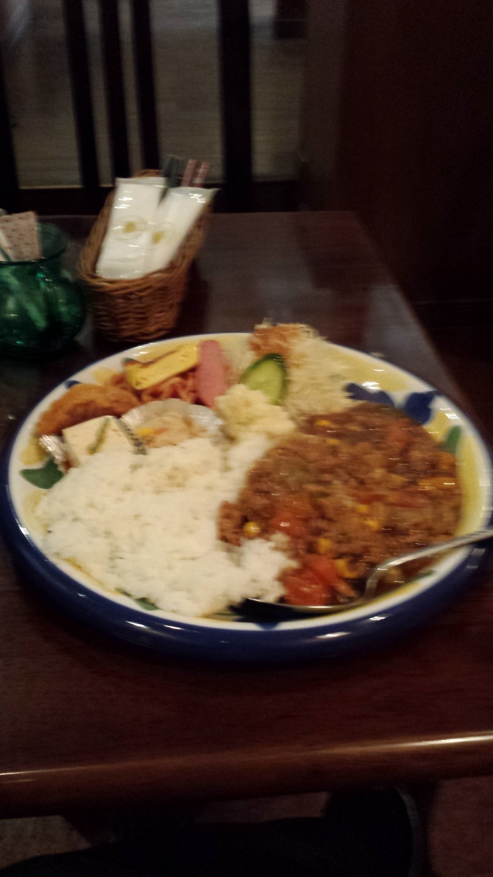 桑園駅前にあるチェーンのコーヒー店です。いつもは本格派のコーヒーを飲みに行く店で、なかなかおいしいストレートコーヒーをだしてくれます。たまたま、この日はランチの時間に行ったので、キーマカレーのメニューを見て、注文しました。この店でキーマカレーを食べたのは初めてでしたが、ワンプレートの中に豆腐やサラダ、ソーセージなどのおかずも入っています。キーマカレーそのものもちょうどいい辛さでした。コーヒーつきで700円です。サービスコーヒーもいい味でした。