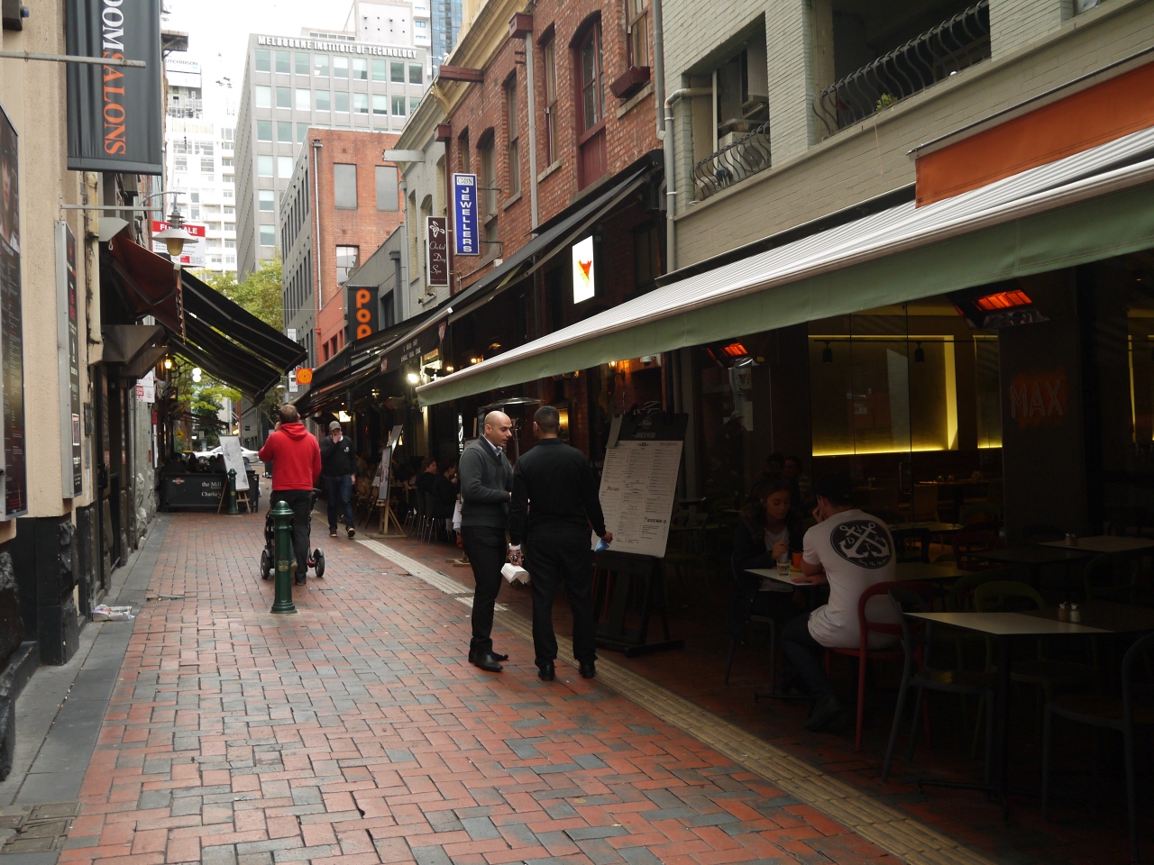 宿泊先のHotel ibis Melbourne Little Bourke Streetからリトルバークストリート沿いにレーンを探しながら歩いて見ました。クィーンストリートとエリザベスストリートの中間にあるレーンで本格的なイタリアンを食べることができるそうです。このリトルバークストリート沿いにはそのようなレストランやおもしろいレーンを見かけることができ、たいへん街歩きが楽しいです。