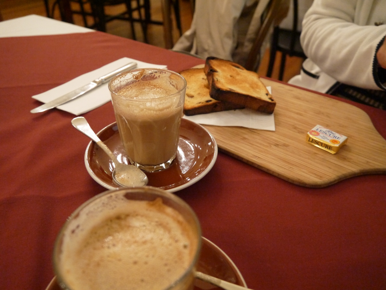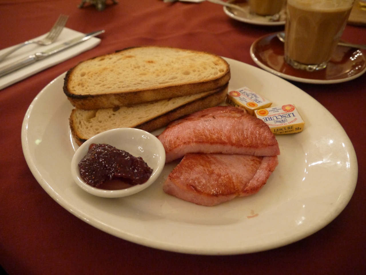 妻が風邪のため、ディナーで来ることはできませんでしたが、バンクプレイスは気に入っていたので、最終日に朝食を取りに再訪しました。妻は、フルーツブレッドを私は、自家製ジャムをつけたトーストとハムを頼んだのですが、この朝食は海外で食べた中では1,2を争うといっていいほどのものでした。トーストは堅めで、カリカリに焼かれていて、ナイフを使って塗るにはちょっと苦労するぐらいに堅めに作られたイチゴジャムとがぴったりあいました。豚のハムは朝から食べるにはボリュームがあるほどの厚さがありますが、適度に油が抜けて塩味もちょうどよく、カフェラテとともに本当においしい朝食でした。建物もどうやら歴史的建造物のようで、できれば、ディナーでも来てみたかったレストランです。- 旅行時期