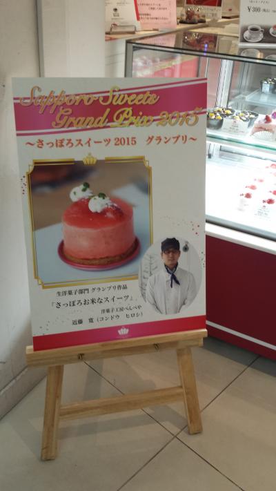 2015サッポロスィーツが決定しました。生洋菓子部門が「さっぽろお米なスイーツ」(洋菓子工房べんべや)、焼菓子部門は、「さっぽろキナコ焼きショコラ」(パティスリ−フレ−ル パティシエ)です。早速、サッポロ地下街オーロラタウンのさっぽろスイーツカフェに行って買ってきました。さっぽろお米なスイーツは、ホントに米粒がそれとわかる程度の柔らかさでケーキの中に入っていて、下のスポンジと異なった食感です。木イチゴを使っていて、ほど良い酸味と適度な甘さです。さっぽろキナコ焼きショコラは、餅米を焼いたものを下に、上側はクッキーにチョコをかけたショコラです。さっぽろスイーツカフェは、毎月、店舗を入れ替えながら、複数のお店のケーキを販売しているため、いろいなスィーツを試してみたいという観光客にとっても便利です。