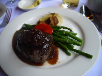 初めに、シャンパンで乾杯して、好きな飲み物を飲みながら、3コースの食事を摂ります。メインの肉料理は熱々に調理されており、量もちょうどよいぐらいでした。