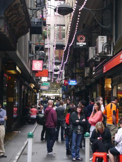 オーストラリアの観光情報の収集は、 オーストラリア政府観光局公式サイトを活用していました。メルボルンについては、有名なデグレーブストリートとカフェをはじめとするレーンとストリートの特集をしていたので、これを参考にレーンとストリート巡りを計画しました。予定していたすべてを回ることはできませんでしたが、主だったところに行きましたので、それぞれの特徴も踏まえて、報告します。デグレーブストリートは、フリンダースストリートからちょっと脇道を入ったところで、すぐにわかります。この小道の真ん中では、オープンカフェが軒を連ね、老若男女のオージーがコーヒーを楽しんでいる日常風景が見られます。狭い道ですが、両脇にもカフェがあり、自分なりのお気に入りの店を見つけて、オージーたちに混ざって一休みするのもいいかと思います。私が行った時は、残念ながらビルの工事中でちょっと薄暗かったのですが、工事が終われば、雰囲気もすてきだと思います。
