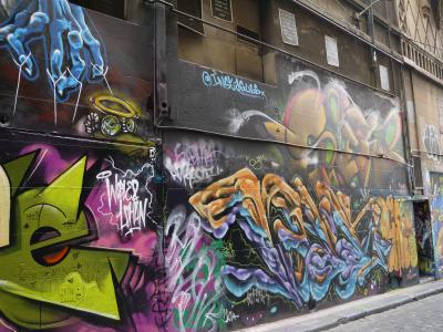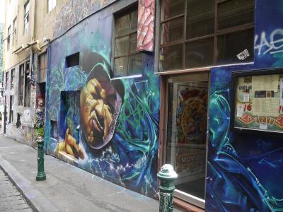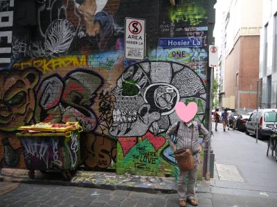 オーストラリアの観光情報の収集は、 オーストラリア政府観光局公式サイトを活用していました。メルボルンについては、有名なデグレーブストリートとカフェをはじめとするレーンとストリートの特集をしていたので、これを参考にレーンとストリート巡りを計画しました。予定していたすべてを回ることはできませんでしたが、主だったところに行きましたので、それぞれの特徴も踏まえて、報告します。ホイザーレーン (ラトリッジ レーン) は、フリンダーズストリート沿いでスワンストンストリートをはさんで、デグレーブストリートと反対の方向にあります。ストリートアート(ただの落書き?いえいえ立派な芸術です)として有名です。他のレーンでも同様なアートがあるところを見かけましたが、ここが一番規模が大きく、道幅が比較的広く日光が入るので、絵がみやすいのではないかと思います。テレビやグーグルマップで見た絵の多くが、入れ替わっていたのでしょっちゅう書き換えられているようです。見学に行ったときも、絵を描いている人をみかけました。
