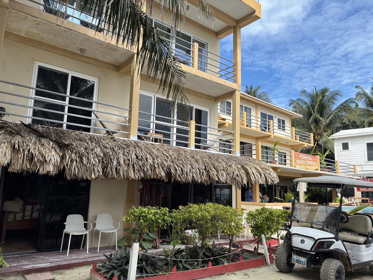 ベリーズシティとのフェリーが発着している場所から徒歩で5分くらいのビーチ沿いにあります。ちょっと道に迷ったのですけれど、最初に目にしたのがホテルの横側なのですが、かなり怪しい雰囲気なんです。正面に行ったら普通という感じで安心しました。庶民的な雰囲気のホテルですけれど、島なので物価が高めです。大きなベッドの部屋ですが、一泊14000円くらいでした。いちよう改装されているみたいですが、昔の時代のホテルという感じです。滞在中、特に不便を感じる事はありませんでしたが、高くてもいいホテルをチョイスした方がいい思います。