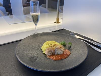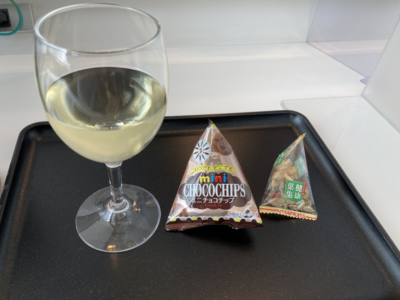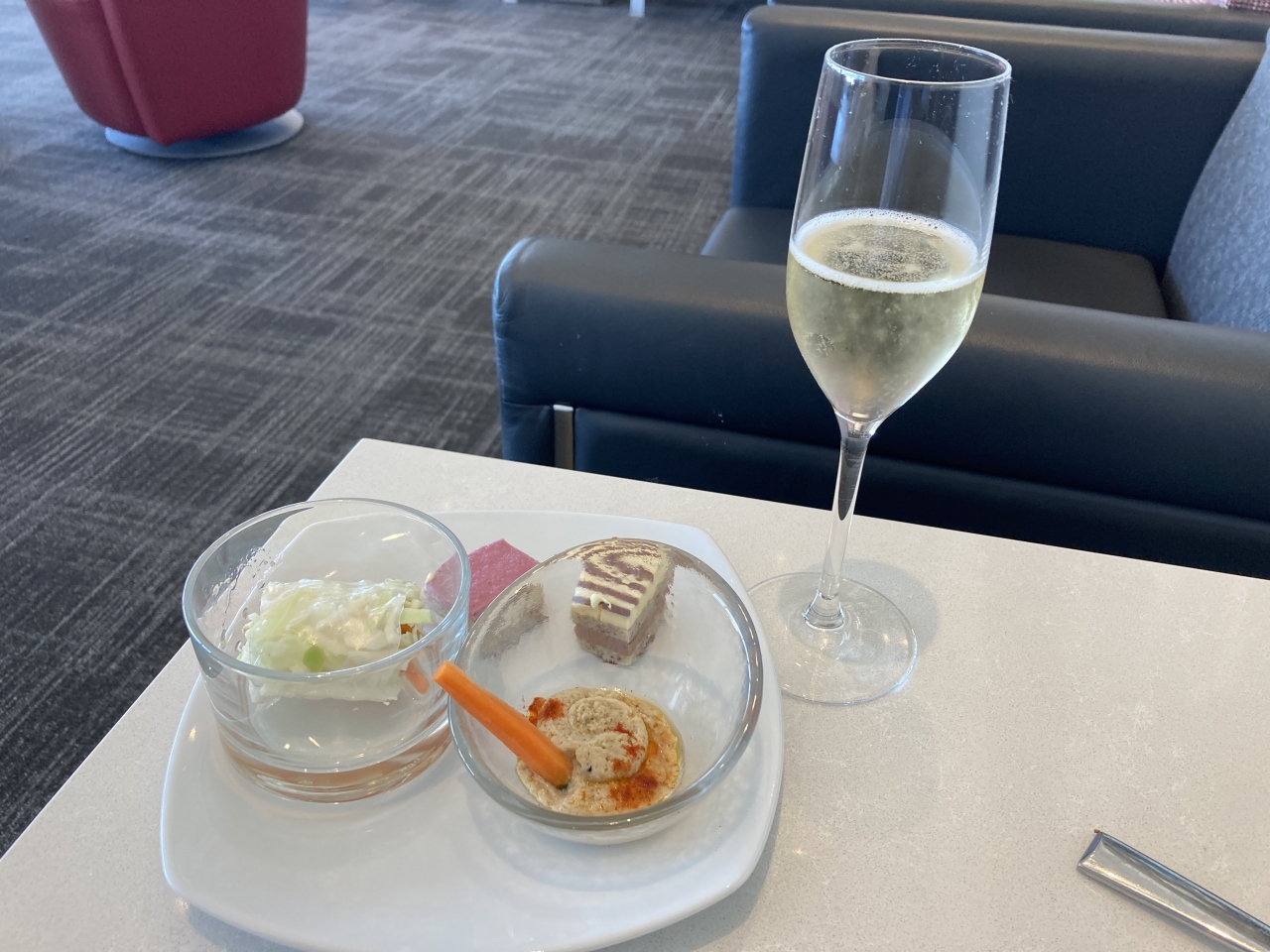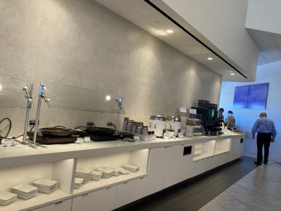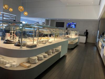 ゆとりのあるスペースのラウンジになっていて、フードメニューも充実しています。バイキングスタイルではなくて、スマホのQRコードで注文するシステムです。操作の仕方をスタッフの方が教えてくれるので、何とか注文することができました。JALらしくクオリティの高い料理になっていて、レストラン感覚で、ゆったりと食事をすることができます。機内食もあるので、食べ過ぎに注意という感じです。