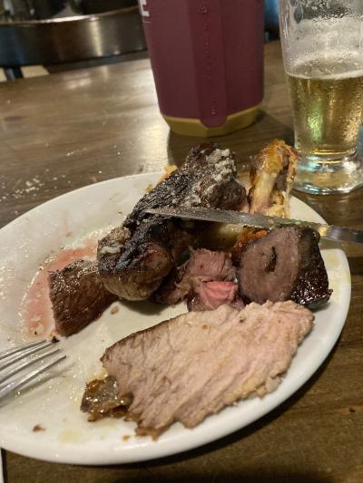 イグアスの滝のある街、フォスドイグアスのセントロエリアにあるブラジル名物のシュハスコを提供しているレストランで、地元の人以外に観光客でも気軽に食事できるお店です。店内に入ると整然とテーブルが並んでいて、バイキングの料理もサラダ、ライス、ブラジル料理にデザートなど30種類以上並んでいて、食べ放題になっています。串刺しのお肉は、ウエイターさんがテーブルまで運んでくれるので、好きな部位を好きなだけ食べることができますが、次々にお肉が運ばれてくるので、あっという間に満腹になってしまいました。ビールの大瓶を2本飲んで、サービス料の10パーセントの入れて100レアル、20ドルくらいです。お得な価格でブラジル料理を楽しむことができて大満足です。お肉や料理のクオリティは価格相応という感じになっています。