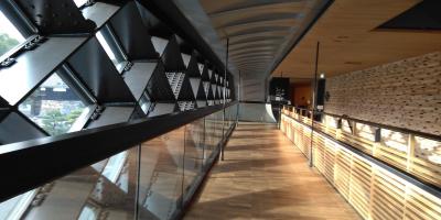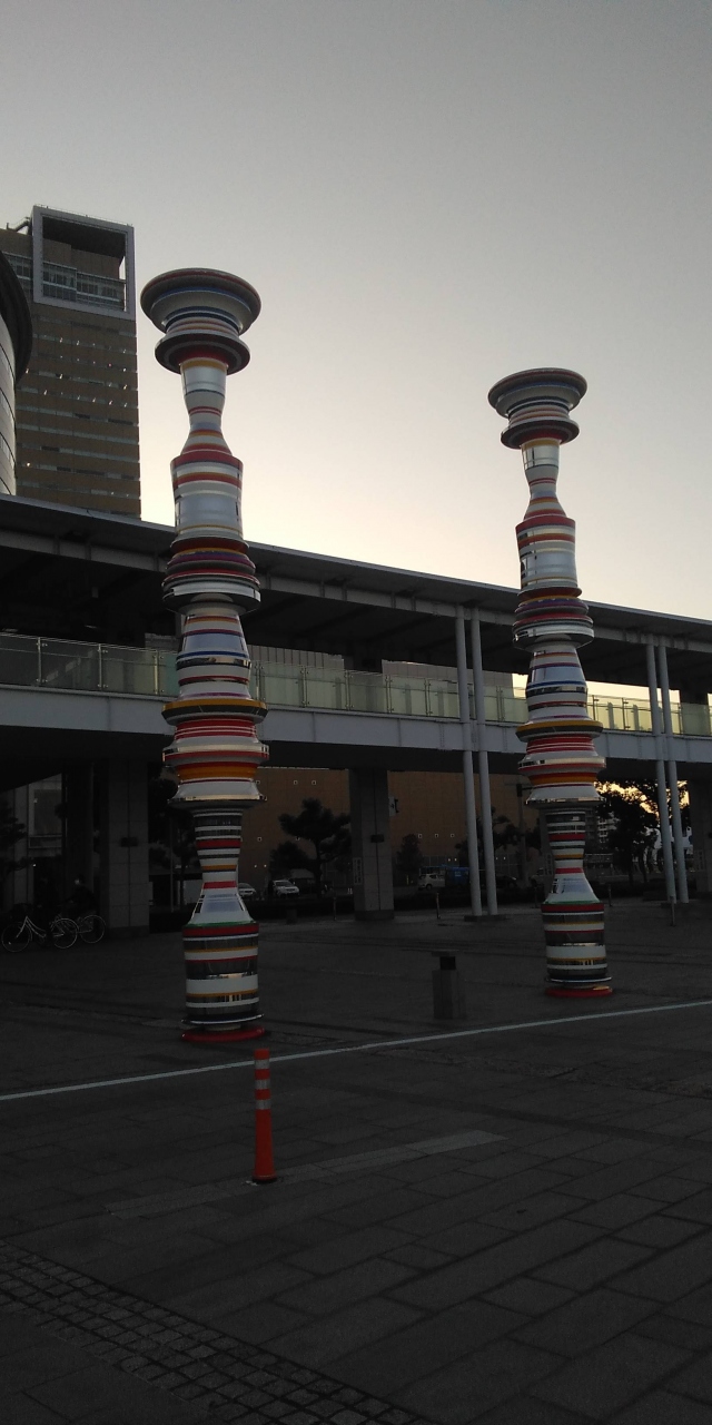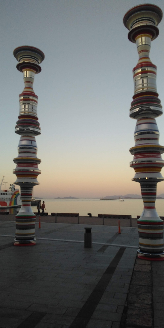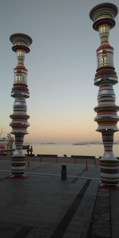 フェリーなどが発着する高松港のターミナルの近くにあるアート作品です。港沿いを散策していたところ、目立つカラフルなポールのような物があったので、近付いて見学することにしました。近くまで行くと意外に高さがあり、キレイな色合いになっていて、一部ガラス張りにもなっています。時間帯や光の反射によって変化するというアートみたいです。港沿いを散策すれば目立っているので、直ぐに見つかると思います。