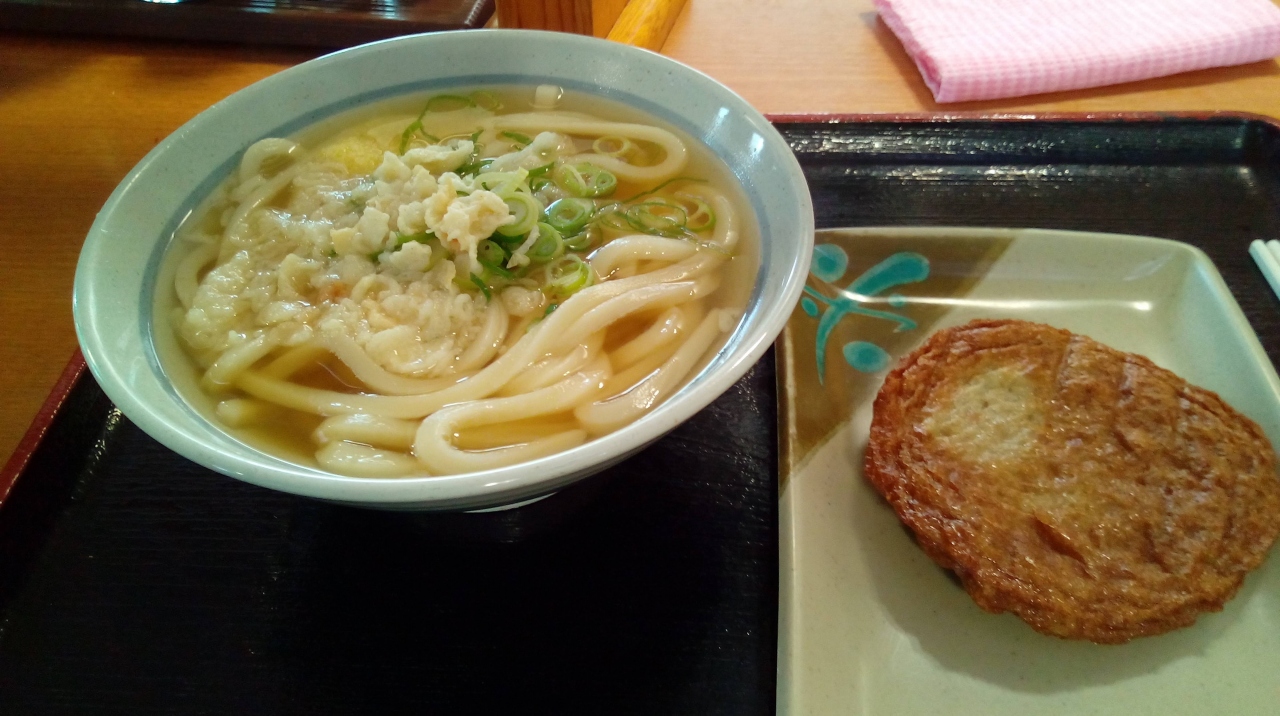 JR高松駅前という便利な立地にある讃岐うどん屋さんです。奥行きがあって広々としたキレイな店内です。お店に入るとカウンターがあって、そちらで注文して、定番の天ぷらも並んでいるので好みの物をお皿に盛って会計をいうシステムです。カウンターに行列が出来ていました。駅前ということで、観光客の人がバスや列車に乗る前に利用している感じです。かけうどん、じゃこ天を選択しました。じゃこ天が名物ということなのでトライです。うどんはアッサリしていて、おつゆの出汁も塩気がやや強めという感じでした。じゃこ天は思ったより個性がなくて、美味しいですけれど、やや期待外れという感じでした。会計は450円くらいだったと思います。やはりお安いですね。うどんの小でしたが、満足できる量ですよ。