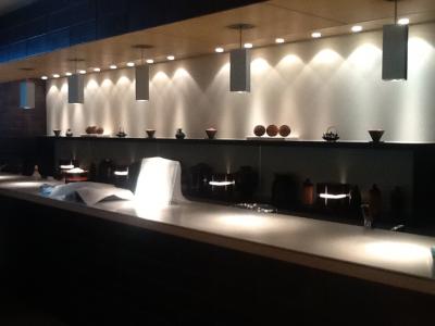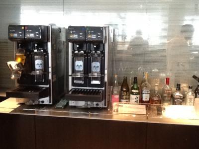 搭乗前までの時間に利用しました。さすが日本のラウンジですね。清潔で機能的なレイアウトになっています。寿司バーらしきカウンターがあって、5時から職人さんが握りたてのお寿司をサービスしてくれるのです。これはテンションがあがりますね。人気のイベントです。ちょっとした列が出来ているのです。日本人以外に外国人の方も並んでいました。日本らしいサービスですね。