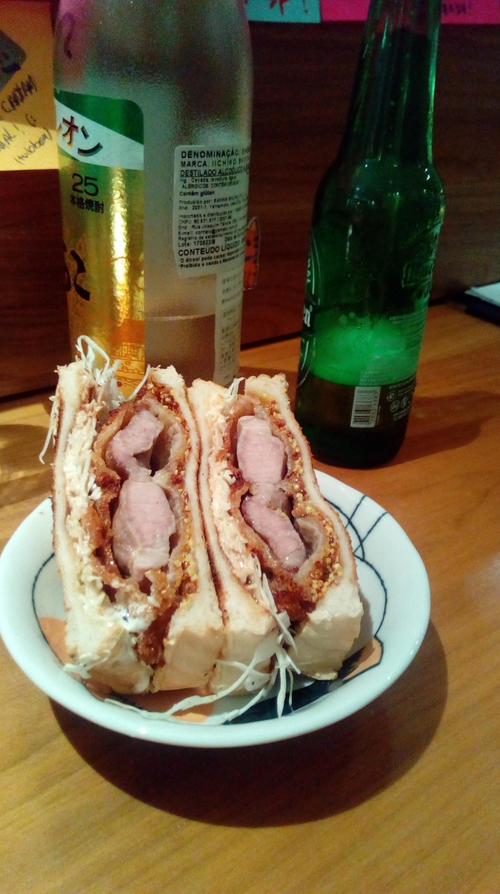トロントのダウンタウンのビジネス街のパウリスタ大通りから脇道に入って、坂道を下って行き、更に脇道に入った場所にあり、繁華街エリアではないので、ちょっと分かりにくい立地になっていますが、常連さんが多みたいで狭い店内は賑わっていました。昔のスタイルのカラオケ屋さんという感じの雰囲気になっています。日本語が通じるのが有難いですし、日本の焼酎も飲むことができます。輸入品なので、ちょっと高めのプライスですけれど、ビールに飽きてきたので、焼酎の水割りを注文しました。お酒のお供に合うメニューもあって、餃子にカツサンドをお願いします。カツが暑くて、食べ応えがあるカツサンドで、日本の味という感じがします。賑やかなお店で楽しく飲むことができました、