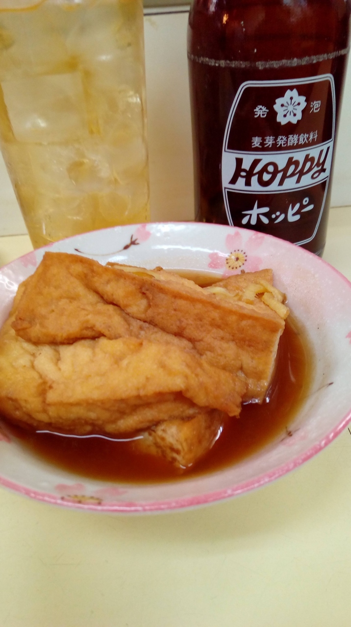 京急の川崎駅の近くにありますけれど、賑やかな繁華街ではなくて、ちょっと脇道に入った場所にあって、常連さんで賑わっている立ち飲み屋さんです。息子さんと両親で家族で経営している感じです。お店に入ると直ぐの場所にカウンターがあって、そちらに料理が並んでいたりするので、そちらを見て注文することができるのがいいと思います。お酒や料理の価格は立ち飲み価格でリーズナブルです。さんまが美味しそうだったので注文しました。直ぐに温めてくれて、大根おろしを添えて提供されました。厚揚げの煮物は、ちょっと濃いめの味ですけれど、お酒に合う味付けにしているのだと思います。長居するお店はなくて、サックと飲んでという感じになっています。