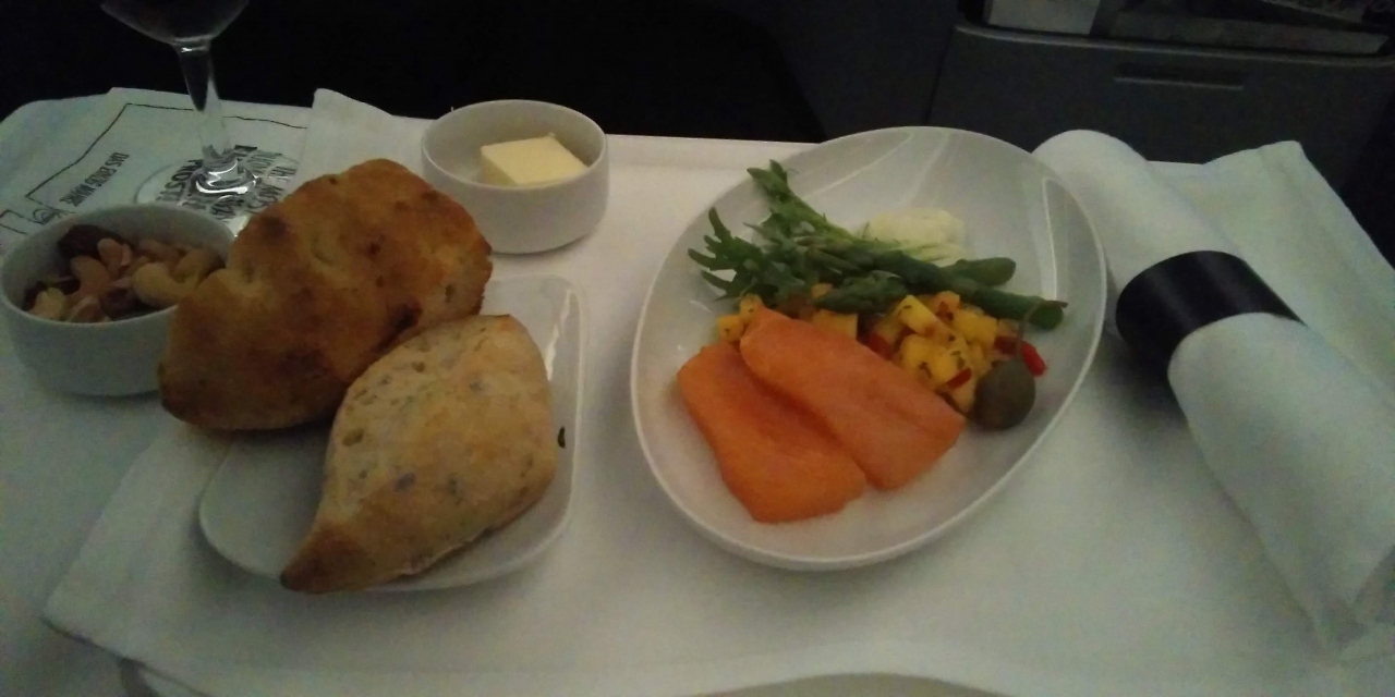 コロナの影響で利用客が少ないので、ボーイングの大きな機体ではなくて、エアバスの機体で運行しています。ボーイングの2階建ての機体だったのですけれど、残念ながら変更されたようです。真ん中の列の座席にしましたけれど、プライベート感のないデザインになっています。CAの方の対応は抜群ですけれど、もちろん、日本語を話せるスタッフは居ません。日本の映画などもありますけれど、日本の会社に比べると種類が少ないのは仕方ないですね。機内サービスは、離陸してから早めに始まりました。期待していなかったのですけれど、思ったりよりもよかったです。7時間半のフライトで2回の食事がありますけれど、一度目が終了してから、4時間後に2回目ですから、さすがにお断りしてしまいました。アメリカの航空会社に比べると快適に過ごすことができました。