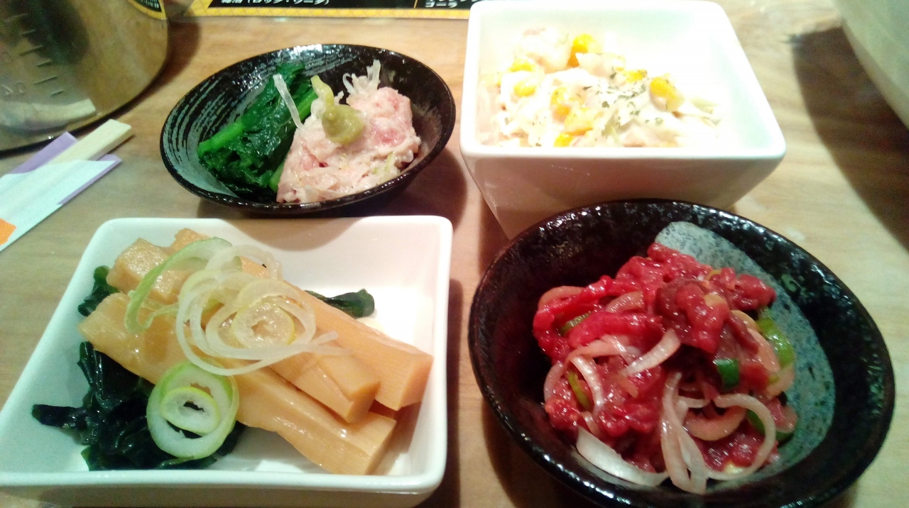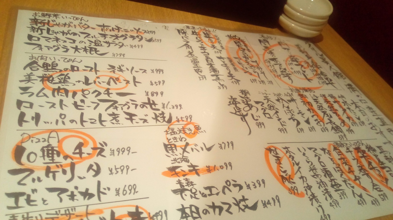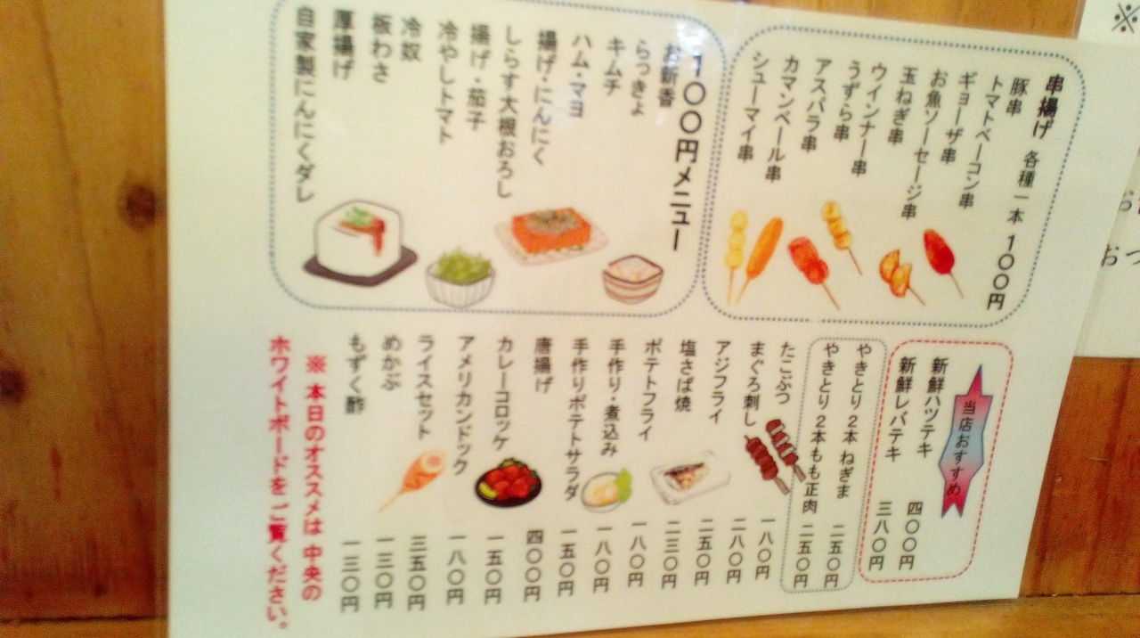 激安居酒屋という感じの雰囲気で、若いスタッフが元気に接客していて気持ちがいいですね。メニューは普通の居酒屋メニューですけれど、いくつかお店のお勧めがあるので、初めての人は、そちらを注文した方がいいと思います。
