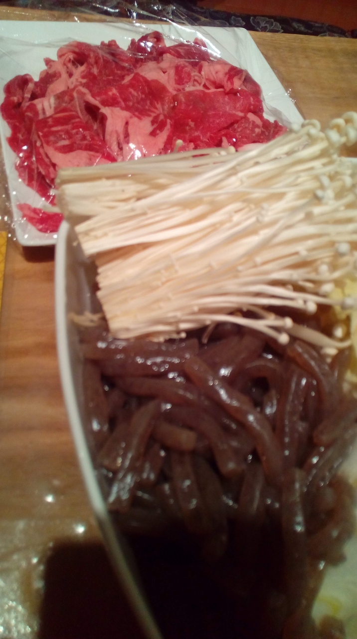 宴会メニューですが、すき焼き、小皿の料理が提供されました。