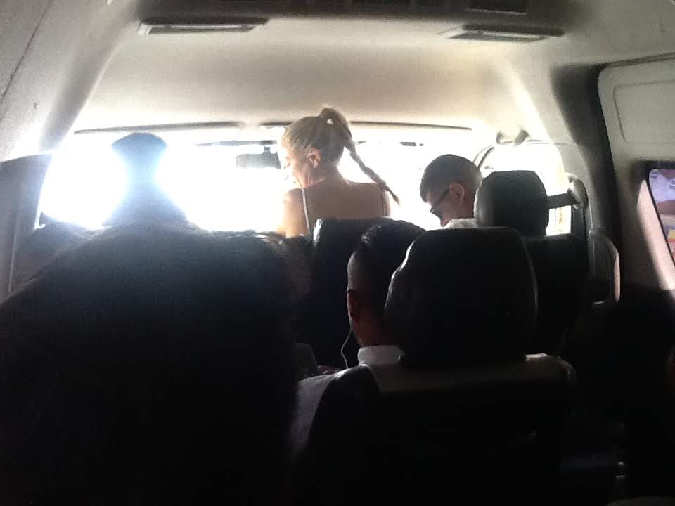 狭い車内に沢山の人が乗車する乗り合いのバンです。