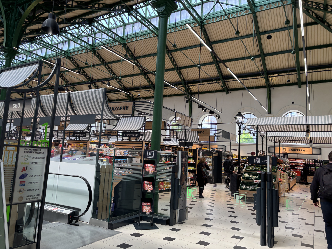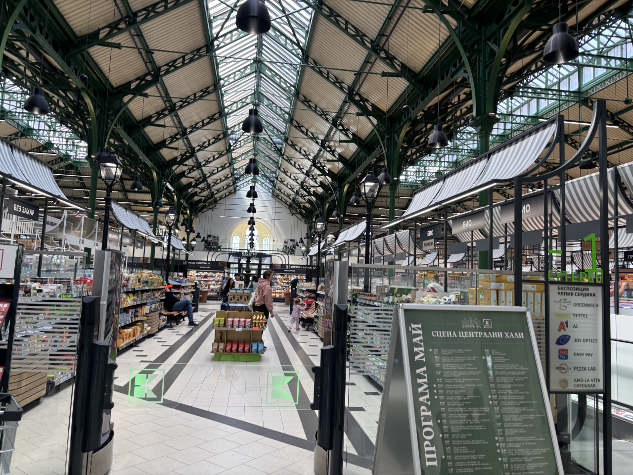 ソフィアの街の中心エリアにあり、地下鉄のセルディカ駅の近くで、目の前に観光案内所、モスクなどがあります。立派な外観の建物、かなり歴史がある建築物のようです。ただ、建物内に入ると大手のスーパーがあるだけという感じで、2階の狭いスペースに軽食店があるだけです。スーパーは、広々として清潔感があって、お買い物を気軽にできます。ソフィアの物価を知るにもいいスポットで、パンやスナックなど購入しました。ですから、ちょっとしたお買い物をするのにおススメの場所になっています。