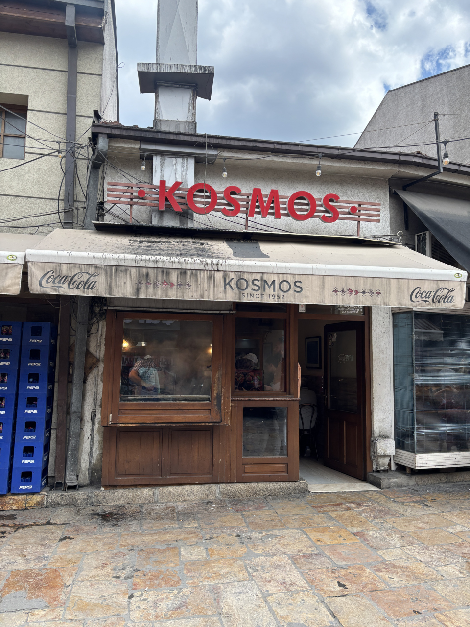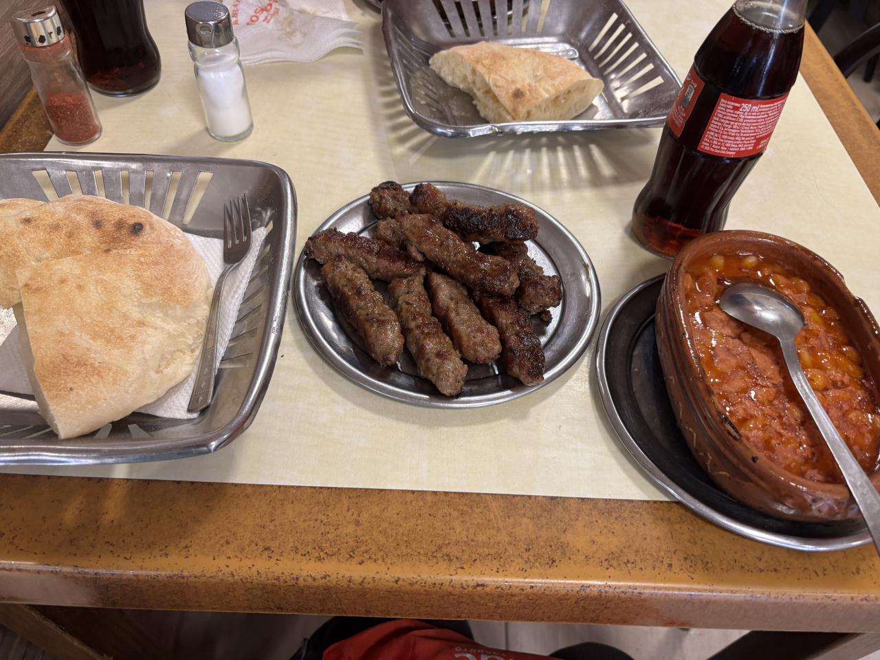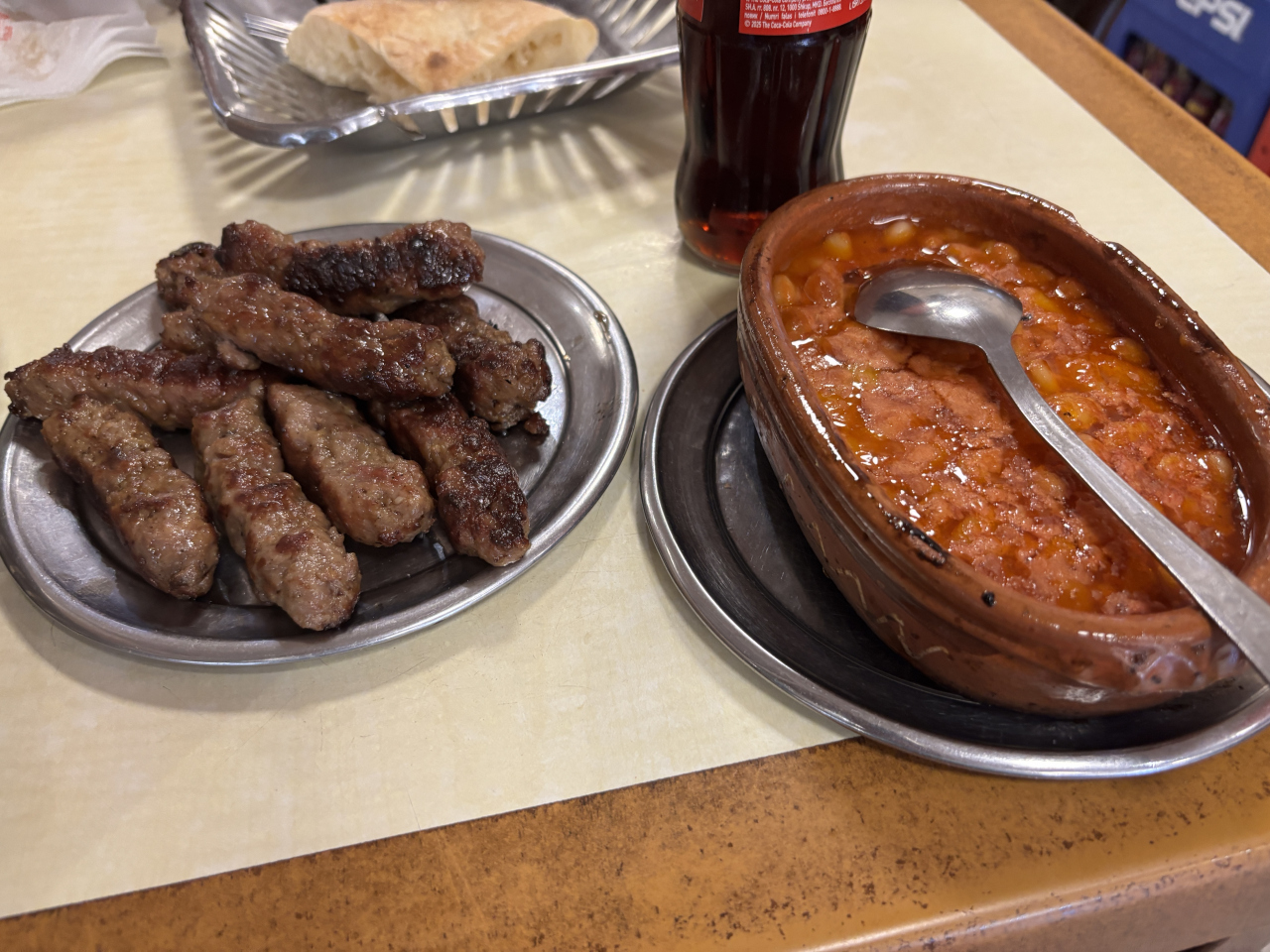 スコピエの街の観光エリアにもなっているオールドバザール内にあるレストランです。観光エリアですけれど、観光客だけではなくて、地元の方にも大人気になっていて、いつも行列ができています。何度か行ったのですけれど、行列で入ることができませんでしたが、たまたま行列がなくて、入ることができました。大衆食堂という感じなので、ゆったりと食事できる雰囲気ではありません。ちゃんと料理の写真付きのメニューがありますけれど、メニューの種類が少なくて、周りの人も定番の料理を食べています。私も皆と同じ料理を注文です。バーベキューがメインになっていて、入り口付近で沢山のお肉が焼かれています。あと、郷土料理の豆の煮込みも熱々で美味しかったです。ゆったりと食事したい人には不向きなお店で、人気店で食事したい人向けですね。食事後に外で出たら大行列になっていました。付近に同じタイプのお店が沢山ありますけれど、このお店だけで混雑しています。