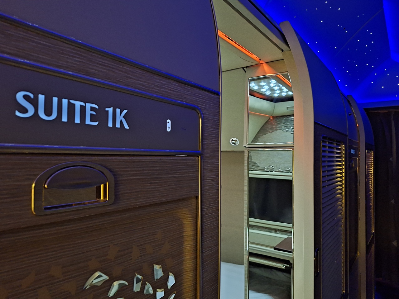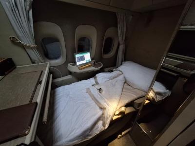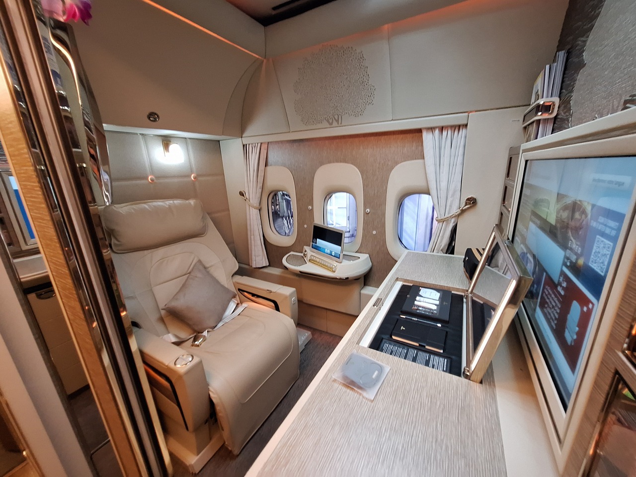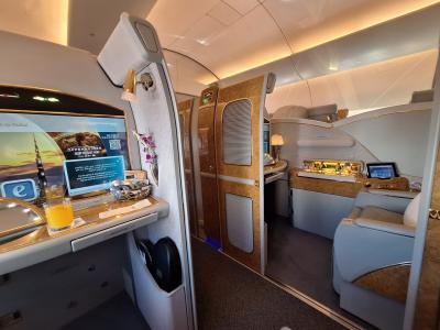 ケープタウンからドバイ経由で関西空港まで、エミレーツ航空ファーストクラスに乗りました。機材はどちらもB777でしたが、関西国際空港行きのファーストクラスは最新鋭のゲームチェンジャーで、ケープタウン発の便とは設備的にかなり違いました。旧型も個室にはなりますが天井までではなく、座席配置も1-2-1であるのに対し、ゲームチェンジャーは1-1-1で横幅も広く、扉も天井まである完全個室になります。