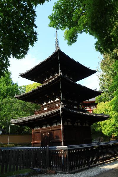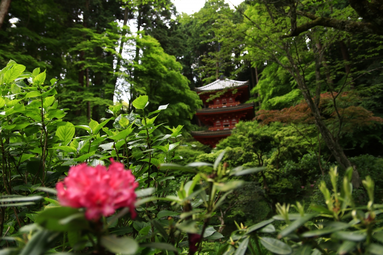 浄瑠璃寺を離れたくらいから急に天候が悪くなりはじめ、寺を訪れたときは雨が降りそうな天気でしたが、かえって新緑の中にある塔の赤色が目立ち美しかったです。本堂では、浄瑠璃寺と同じように住職がお寺の説明をしてくれましたが、今は地位らな山寺となっていますが、鎌倉時代以前は大寺院で、本尊は平等院よりも古いという話でした。